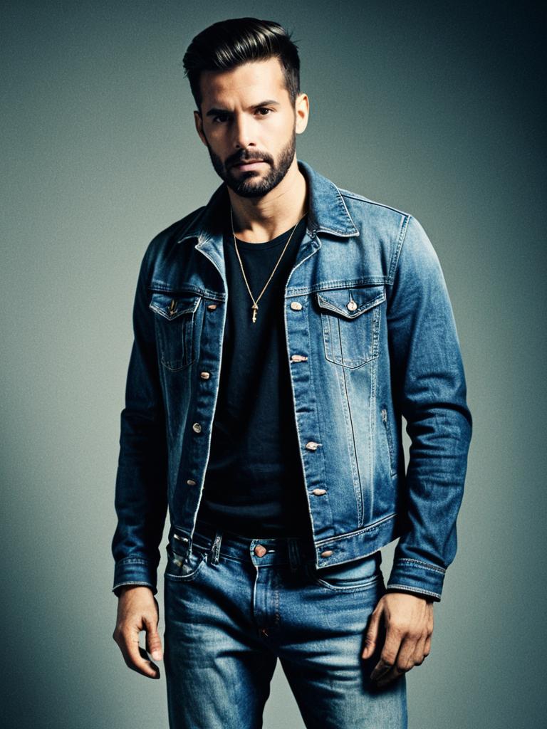 Man in Stylish Jeans Outfit, photorealistic fashion portrait, cinematic realism