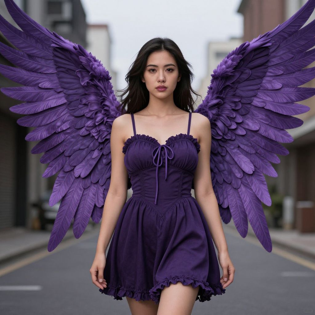 Purple Angel Wings, a woman in a purple dress with wings and a tiable