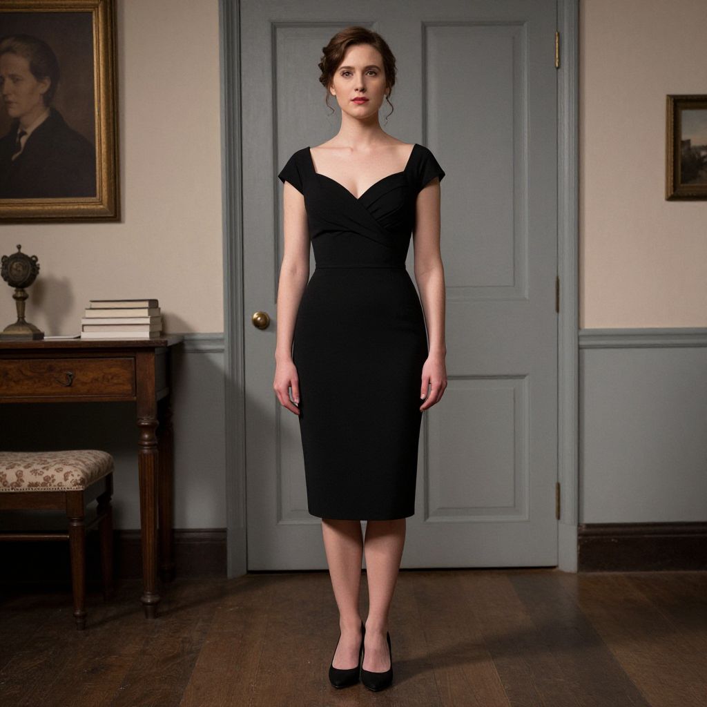 Photograph of a slender, fair-skinned woman with brown hair in a loose updo, standing in a room. She wears a fitted, short-sleeve black dress with a V-neck, and black high-heeled shoes. The background includes a light blue door, wooden floor, and a wooden side table with a cream-upholstered cushioned chair. A framed portrait of a man in a dark suit hangs on the left wall, and a small decorative object sits atop the side table. The lighting is soft, highlighting her elegant, poised stance. The overall style is classic and sophisticated.