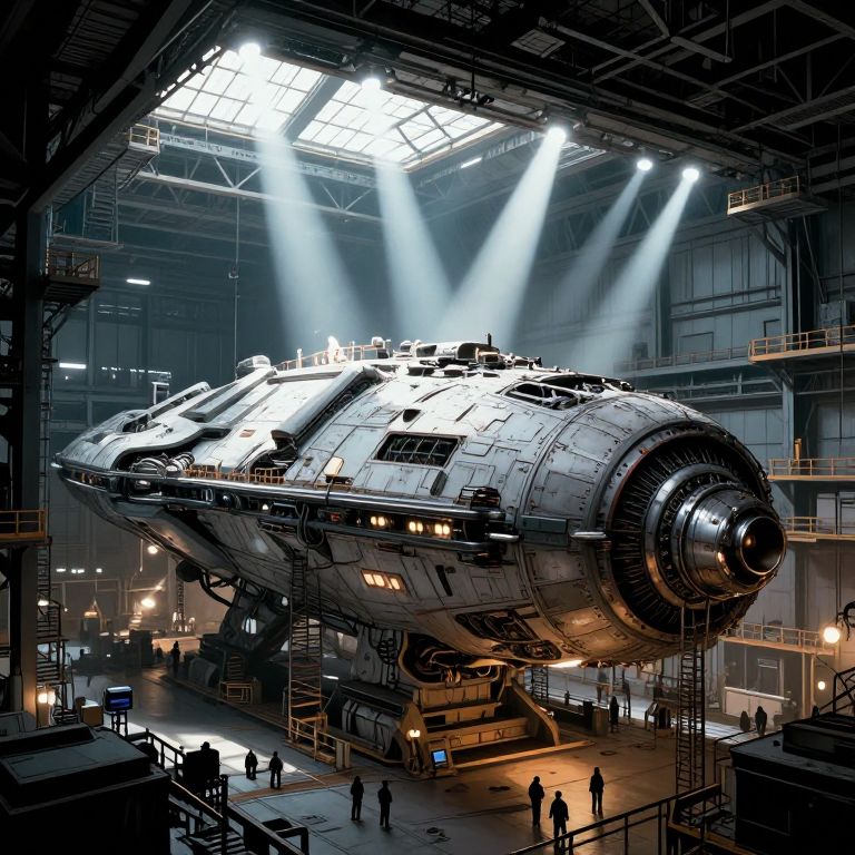 Comic book style: A colossal spacecraft looms inside a cavernous industrial hangar, its metallic hull brimming with reinforced plating and exposed pipes that suggest raw, utilitarian design, The ship’s underbelly glows faintly from scattered lights, its immense engines and propulsion systems hinting at interstellar capabilities, High above, blinding white floodlights pour through vast windows, casting long, angular shadows across catwalks and gantries bustling with activity, Tiny silhouettes of workers, engineers, and scaffolding emphasize the sheer magnitude of the ship, dwarfing everything around it, The hangar itself, an enormous structure of crisscrossing support beams and retractable platforms, hums with machinery, creating a sense of constant movement and purpose, The atmosphere is charged with tension, as if the ship is moments away from embarking on a mission of grave importance, Visible signs of wear on the ship’s exterior tell stories of previous battles, blending history with anticipation for its next journey into the void