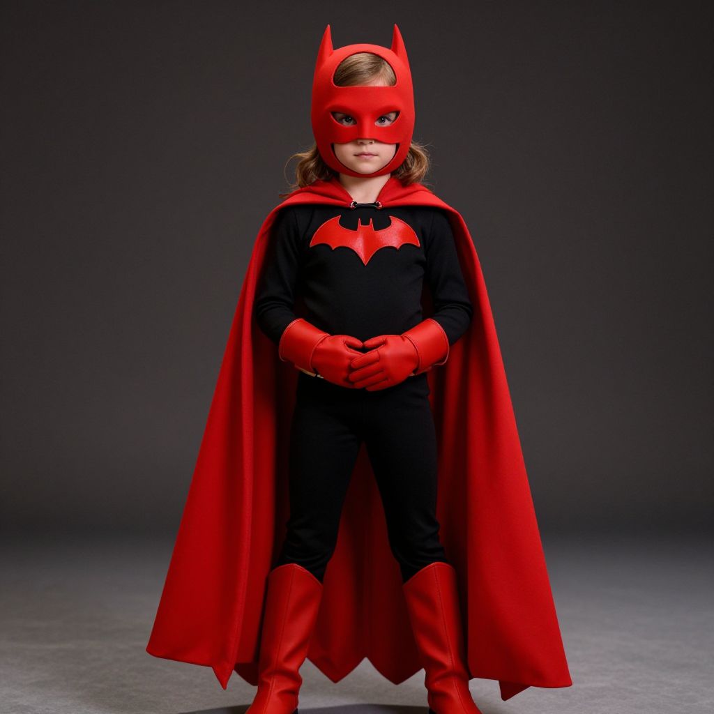 Photograph of a young child standing against a dark gradient background. The child, with light brown hair, wears a red Batman costume including a red cowl with pointed ears, red gloves, a black bodysuit with a red Batman emblem on the chest, and a red cape. The child's hands are clasped together in front, and they have a serious expression. The costume is detailed with a shiny texture, and the cape is slightly billowed. The overall style is classic superhero costume, with vibrant red contrasting against the dark background. The lighting highlights the child's face and costume.