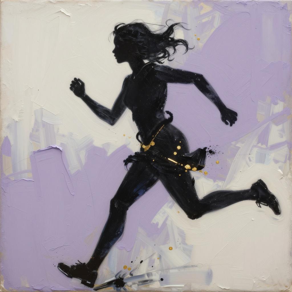 A hyper-stylized painting featuring the silhouette of a young woman in a dynamic running pose. The figure is outlined in bold black paint with flowing hair and is accented with intricate gold paint splashes around the waist area. The background consists of textured brushstrokes in lavender and ivory white, creating contrast and depth. The artwork blends surreal energy with detailed artistic finesse.