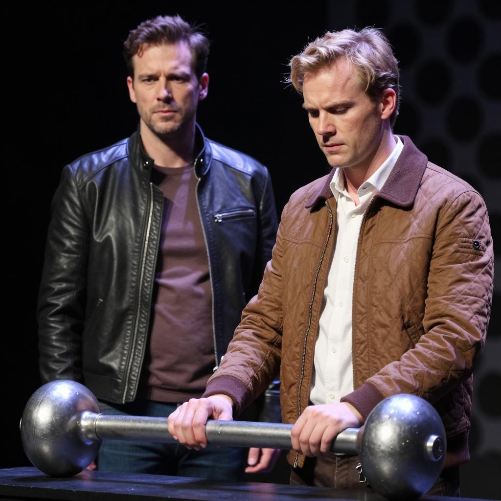 Two men in a dimly lit stage with a large metallic object. Foreground man with blonde hair, brown quilted jacket, white shirt, hands on object, focused expression. Background man with dark hair, black jacket with metallic shoulders, brown shirt, standing, neutral expression. Metallic object has three rounded ends and a central bar. Dark circular background pattern.