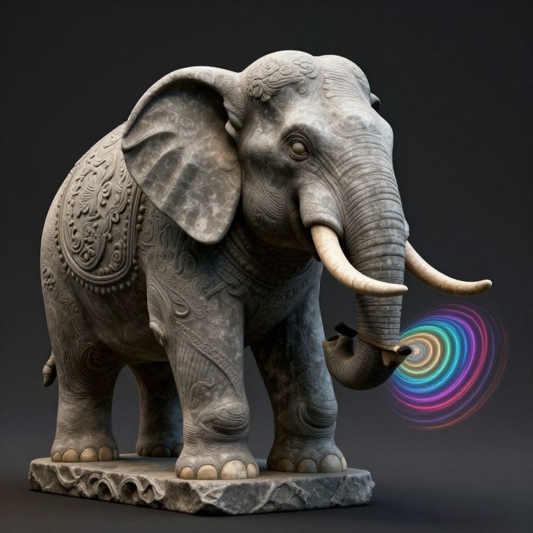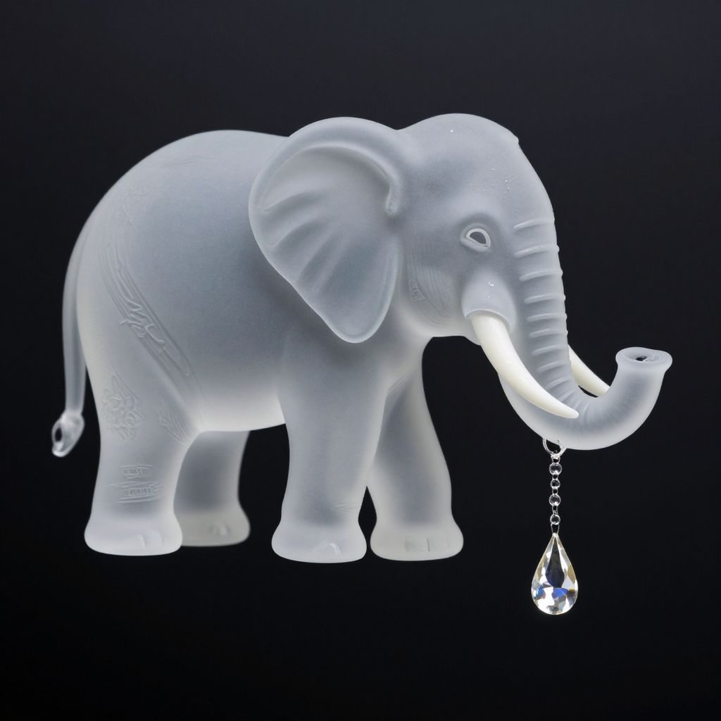 A 3D-rendered elephant, crafted with a textured, pearl-like surface, elegantly drips water droplets from its trunk, embodying the surreal and emotive fusion of animal form and glass-like materials in a high-definition, digital art style.