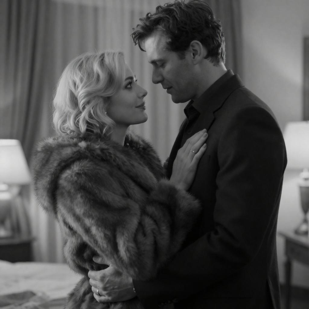 Black and white photograph of a man and woman on a bed. Woman with blonde hair, plaid skirt, and sleeveless top, gently pulls man's arm. Man in white shirt, slightly disheveled, leaning back with relaxed expression. Background includes lamp and patterned wallpaper. Man's pants are off, draped over bed. Woman's right hand on man's chest, left hand on his arm. Soft light, intimate setting.