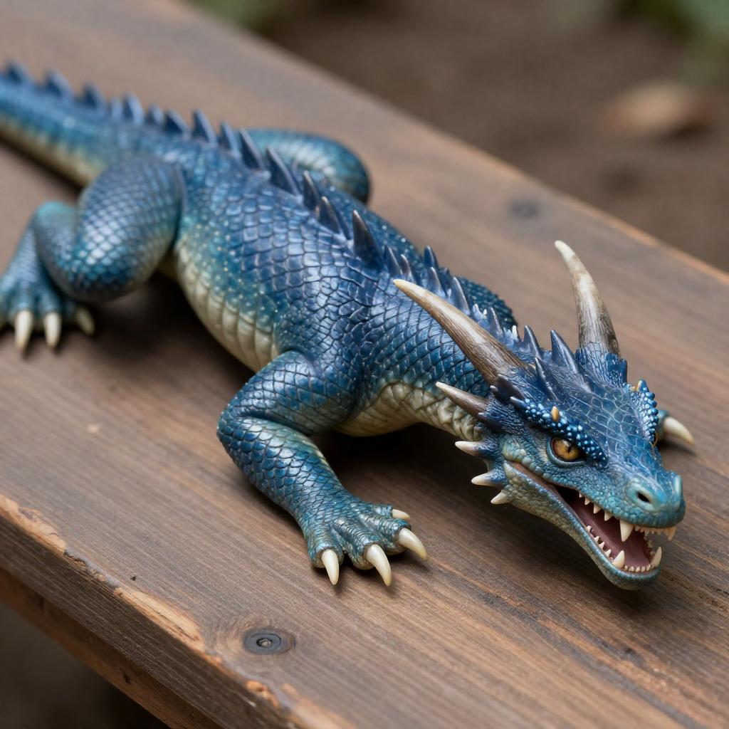 A detailed, realistic photograph of a blue, dragon-like creature with ured scales, sharp teeth, and small horns, lying on a rough, reddish-brown wooden surface. The creature's body is stretched out, with its head turned to the right, showing a slightly open mouth. The background includes a mix of wood and dirt ures.
