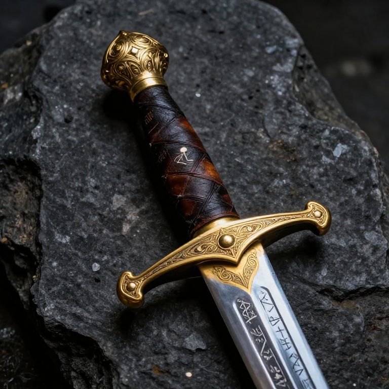A photograph of an intricately designed medieval-style sword resting on a dark, rough-textured rock. The sword has a shiny, silver blade etched with runic symbols and a gold hilt adorned with ornate patterns. The handle is wrapped in dark brown leather with a subtle sheen, featuring a decorative gold pommel. The hilt's crossguard is also gold, matching the intricate detailing on the pommel. The image is sharply focused, highlighting the sword's craftsmanship against the contrasting, rugged texture of the rock. The background is dark, drawing attention to the sword.