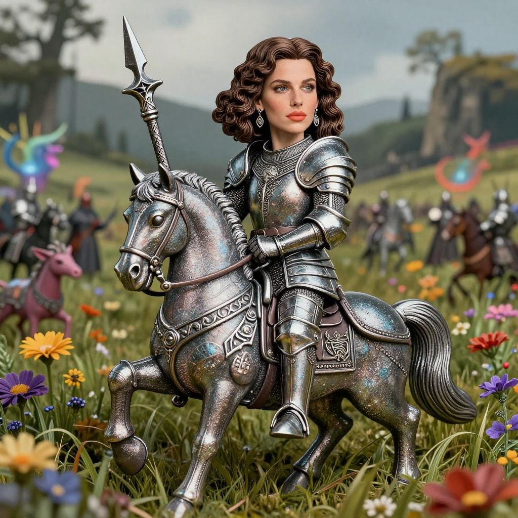 Line art trinket depicting a middle earth, Knight Charging into battle on horseback, wielding a lance and clad in heavy armor, Trailblazer, Short, in shape, Oval Face, Olive Skin, Brunette Hair, grey Eyes, Narrow Nose, Pouty Lips, Prominent Chin, Shoulder-Length Hair, Curly Hair, Straight Bob with Layers, augmented breasts, Drop earrings, coral matte lipstick, An enchanted meadow, with colorful flowers and magical creatures roaming free, Tolkien Constantin Joffe, natural, shimmering, vibrant, gothic, rpg, 1400ad, ultra detailed, detailed, immersive, reminiscent of high fantasy RPG games, HD, masterpiece, best quality, hyper detailed, super realistic, perfect face, perfect hands, award-winning, professional, breathtaking, linquiveradesert Beachthundery weatherfashion editorial style . high fashion, trendy, stylish, editorial, magazine style