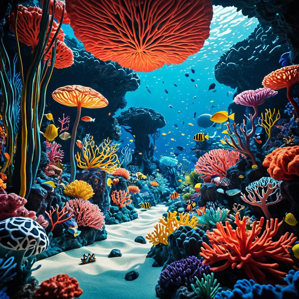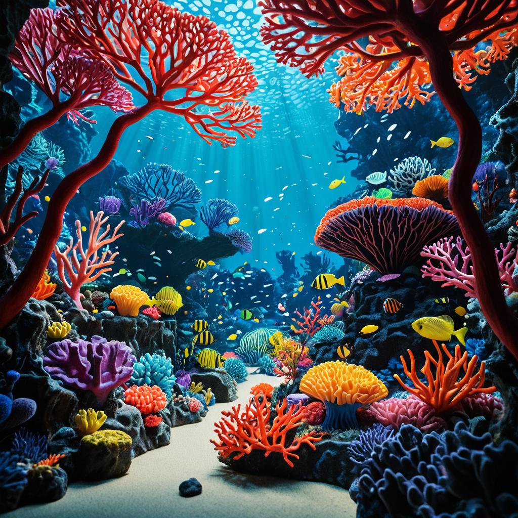 A highly detailed 3D render of a surreal miniature underwater world featuring candy-colored giant coral reefs. The scene is vibrant and glowing with intricate coral details and various tropical fish swimming around. The image blends photorealistic elements with a magical, alien-like atmosphere inspired by the styles of Henri Matisse, Christo, and Georgia O'Keeffe. Cinematic lighting highlights the bright, bold colors and complex background layers, adding depth and intrigue.