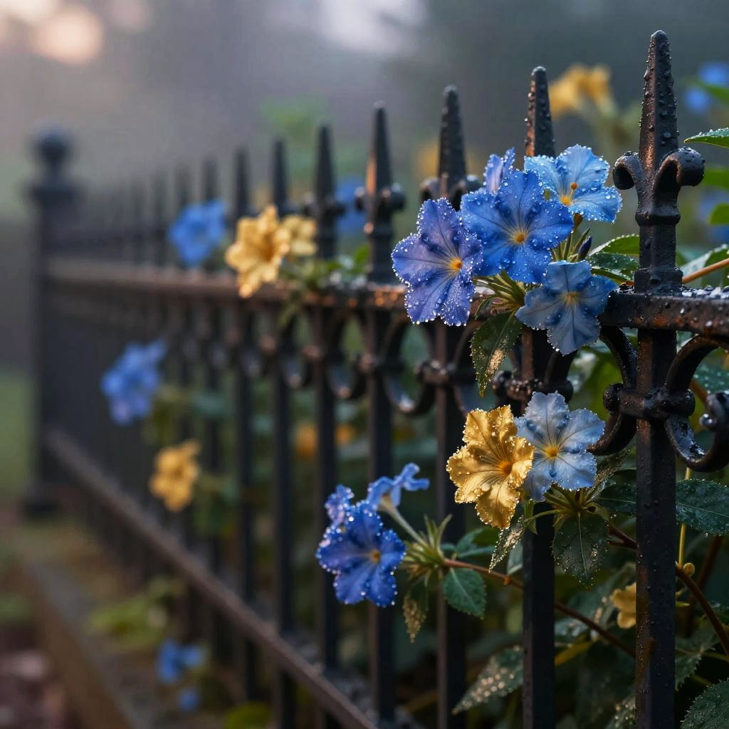 Blue and gold flowers entwined along a vintage wrought iron fence in a tranquil garden, petals shimmering with droplets of rain, detailed foliage and soft mist in the background, evening light casting gentle shadows, creating a mystical and serene ambiance.