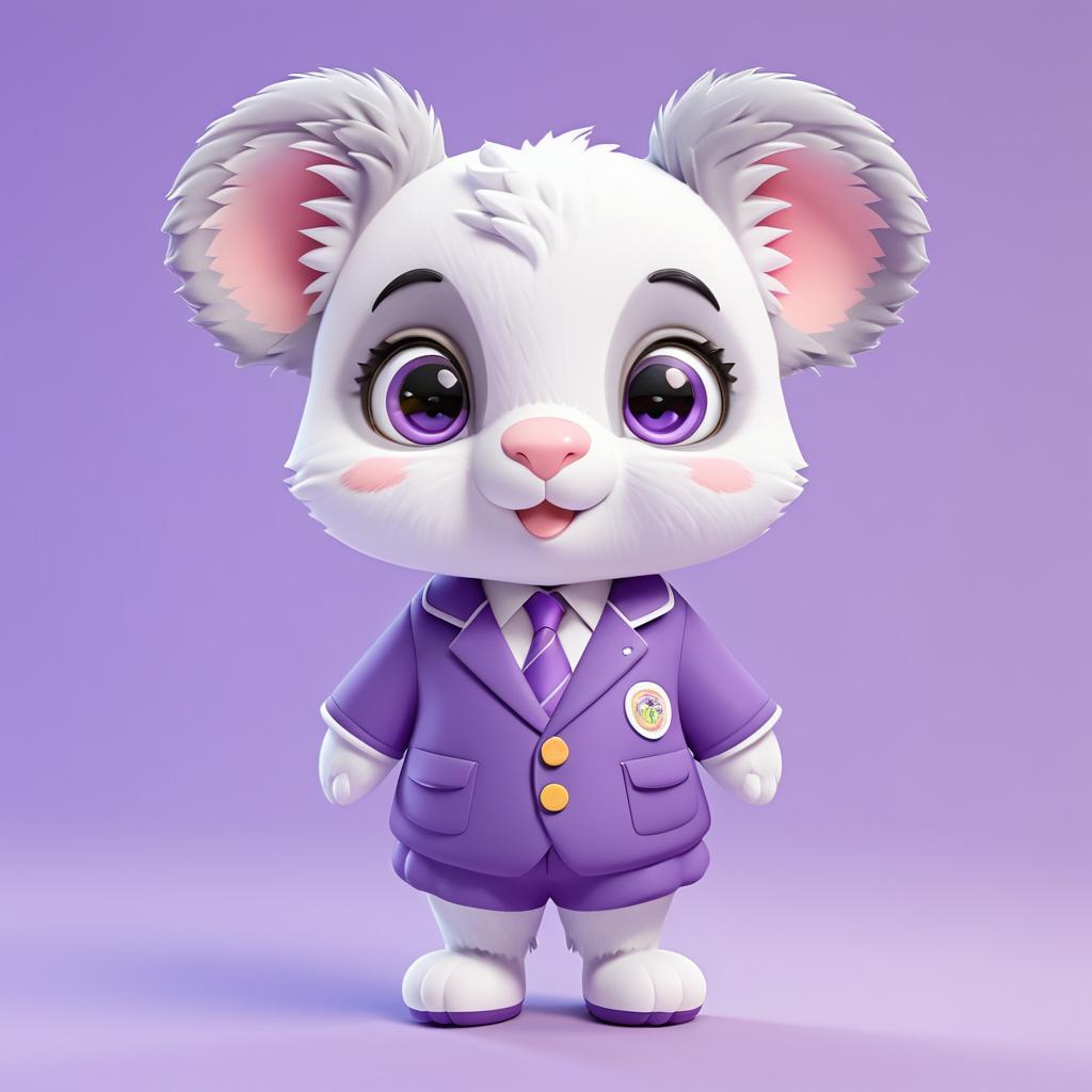 Adorable 3D-rendered cartoon koala in a cute, chibi style. The character has large, expressive eyes and a soft, rounded design, standing in a playful pose on a solid pastel purple background. Dressed in a school uniform, with a high level of detail on the textures and colors. Rendered with vibrant colors and smooth lighting for a warm, friendly feel, creating a delightful, collectible character with a charming, toy-like appearance.