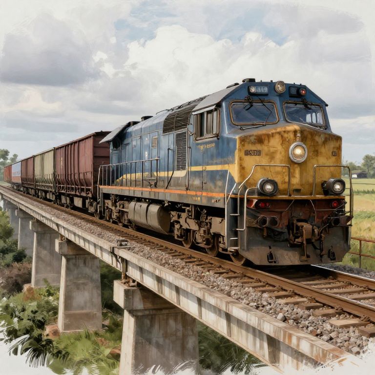 How to draw a train realistic, dynamic composition of a freight train crossing a countryside bridge, meticulous attention to mechanical details, realistic weathering, and complex lighting with cloudy sky background, ultra-detailed rendering