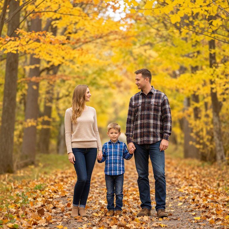 Photograph of a family standing on a leaf-covered path in an autumn forest. The father, wearing a plaid shirt and jeans, stands to the right, holding hands with the mother, who's in a beige top and jeans, and their son, dressed in a blue plaid shirt and jeans. The background is filled with vibrant yellow and orange leaves.