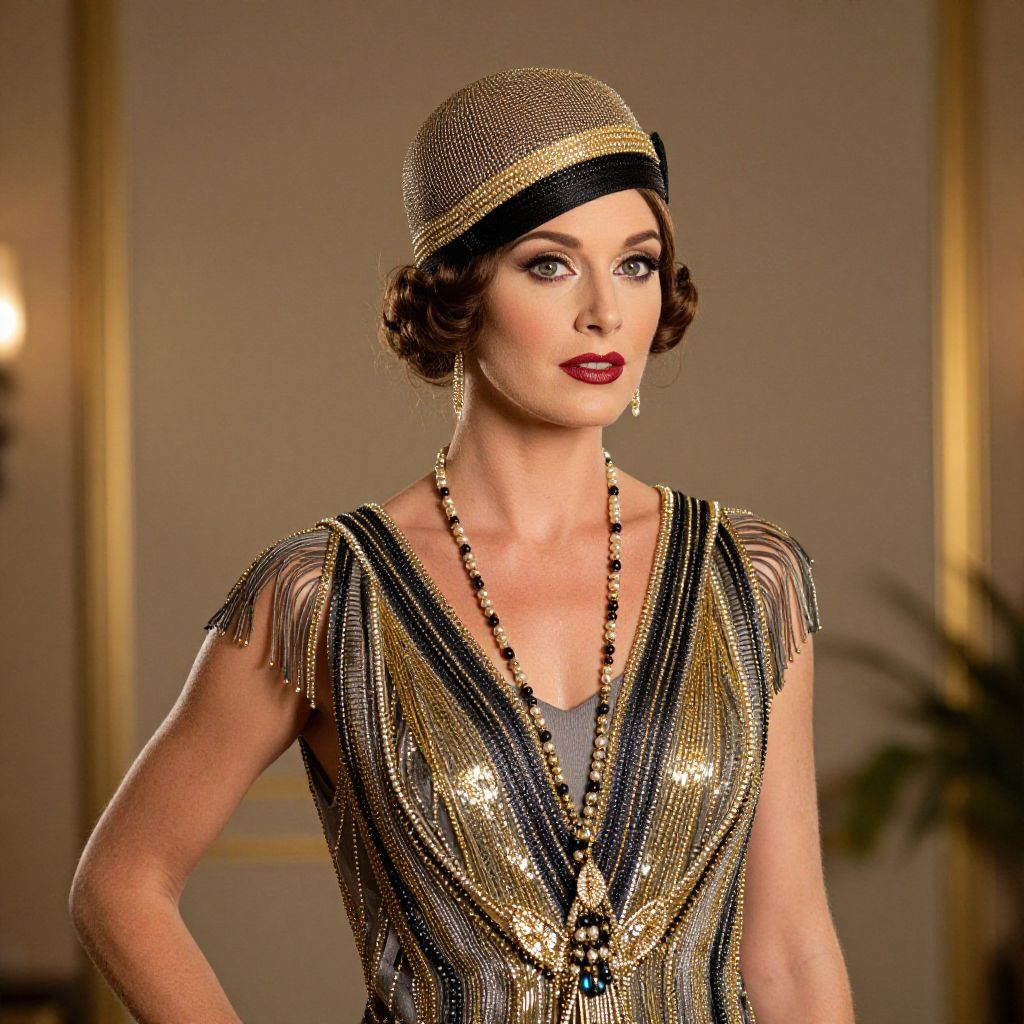 A woman elegantly dressed in a Great Gatsby-style attire, featuring a vintage flapper dress with exquisite beading, paired with a classic 1920s cloche hat, evokes the glamorous spirit of the Roaring Twenties.