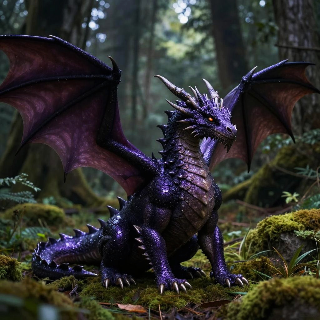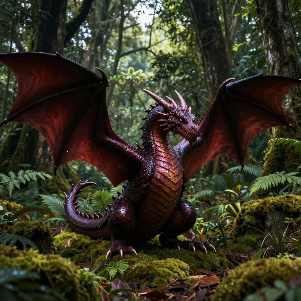 A colossal spring green dragon with vibrant lime scales and sprightly wings held high, resting on a soft moss carpet in a lush, dark forest with a heavy canopy. The dragon's scales glisten in the sunlight filtering through the dense trees.