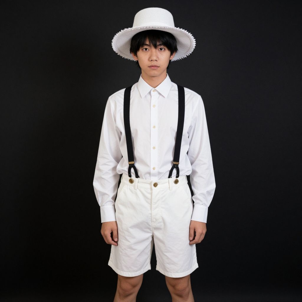 Photograph of an Asian male standing against a solid black background. He has short black hair and wears a white wide-brimmed hat, a white long-sleeved shirt, and white shorts. He is also wearing black suspenders with gold buttons on his shorts. His expression is neutral, and he stands with his hands by his sides. The white clothing contrasts sharply with the black background, making him the focal point of the image. The lighting is even, highlighting the clean lines and textures of his outfit.