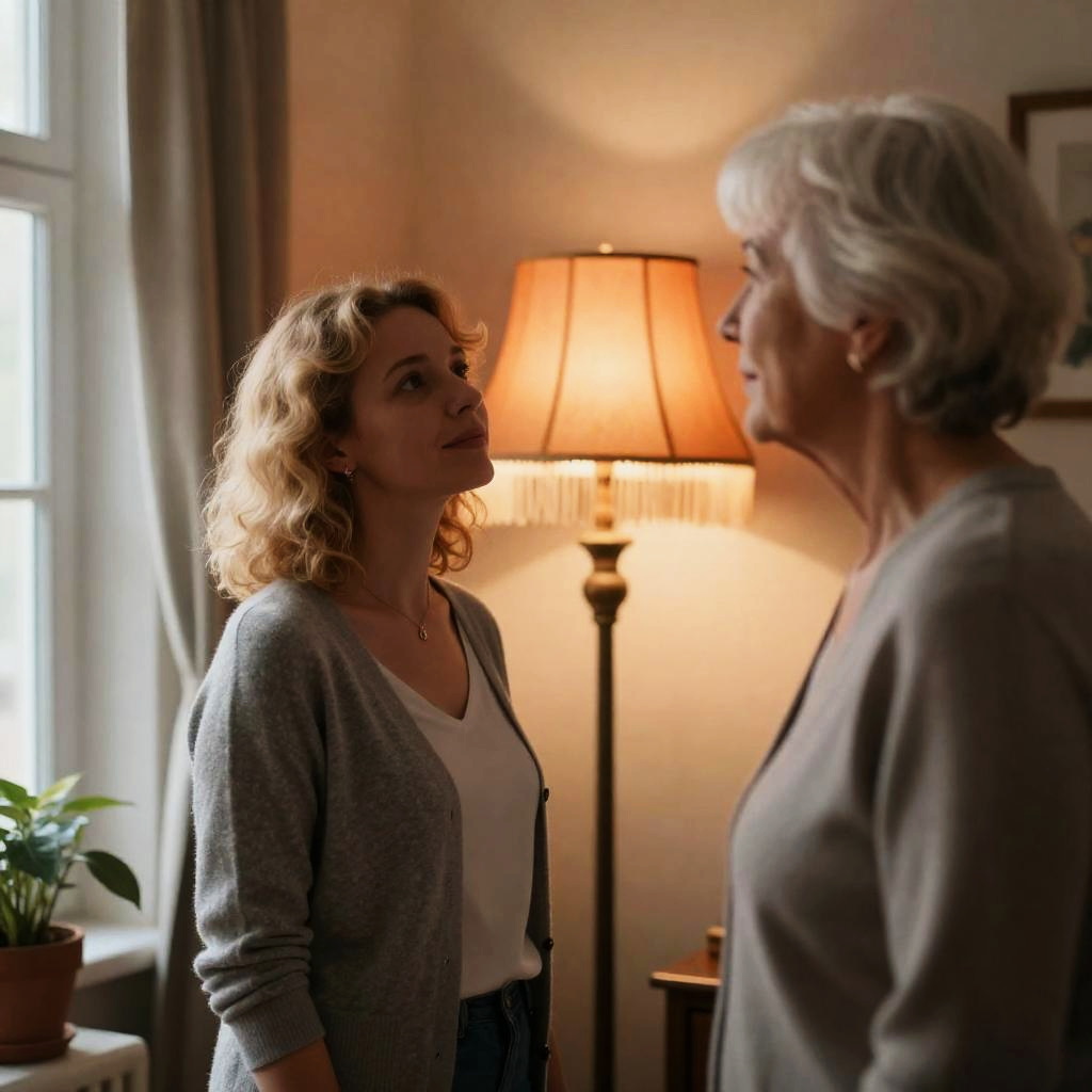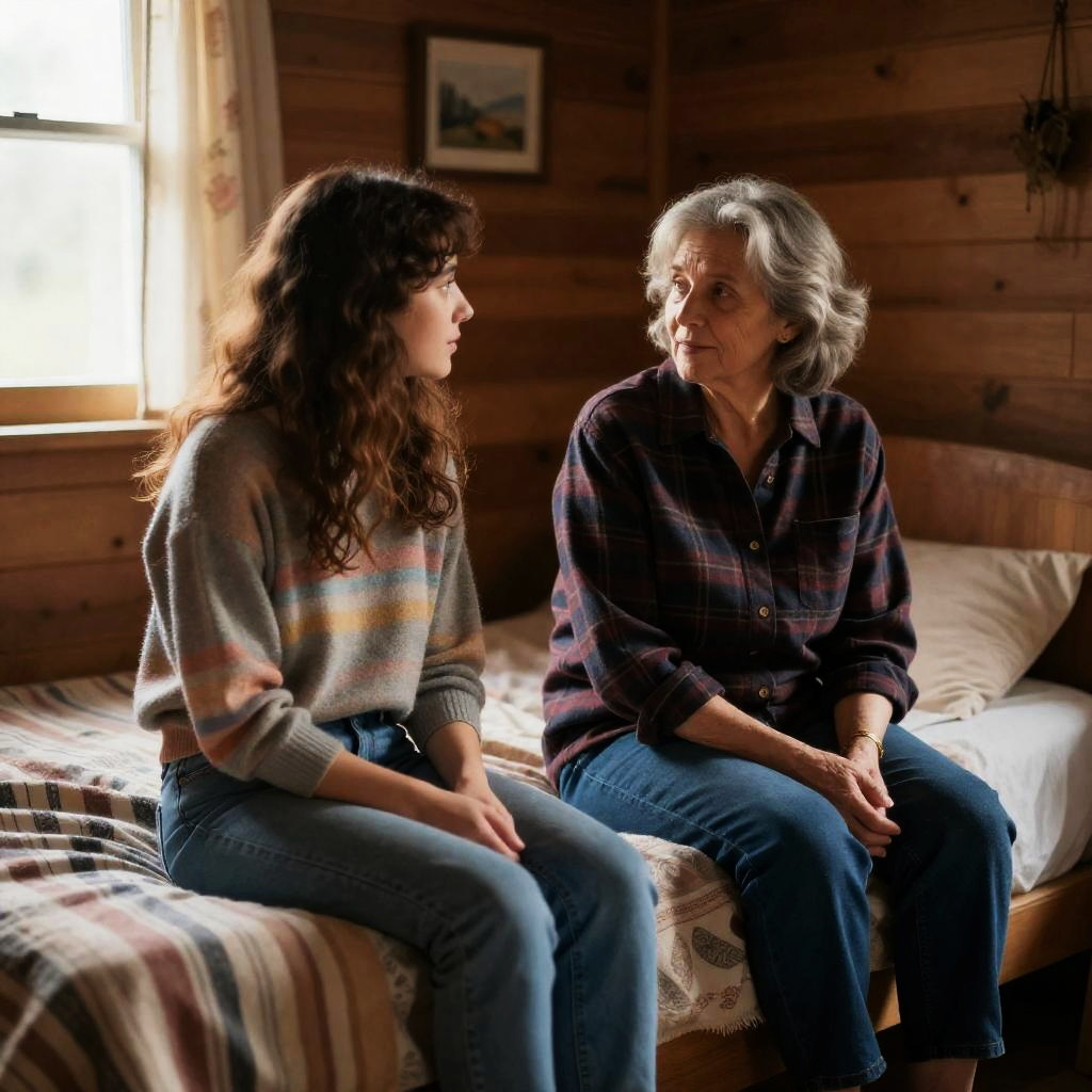 Black and white photograph featuring an older woman with curly hair wearing a patterned shawl, holding a younger woman with short, wavy hair in a frilled blouse. The younger woman rests her head on the older woman's shoulder, conveying a tender and emotional moment. The background includes a window with grid pattern, adding soft natural light to the intimate scene.