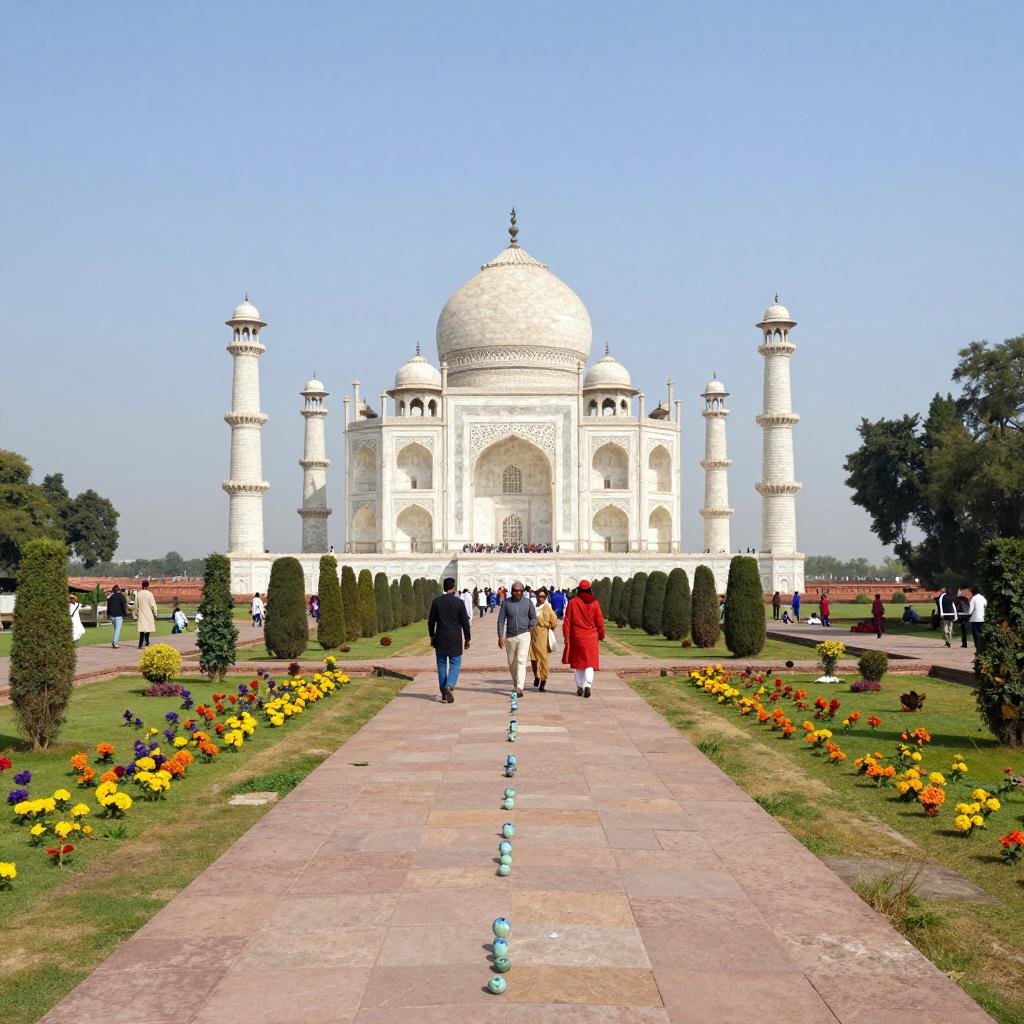 Vibrant Mughal garden featuring a stone pathway leading towards an iconic Mughal architectural monument in the background. The garden is filled with colorful flowers including yellow, orange, red, and purple blooms, surrounded by dense green trees. People in traditional attire are walking and enjoying the scenic landscape under a bright sunny sky. The image captures a serene and historical atmosphere typical of Indian Mughal garden settings.