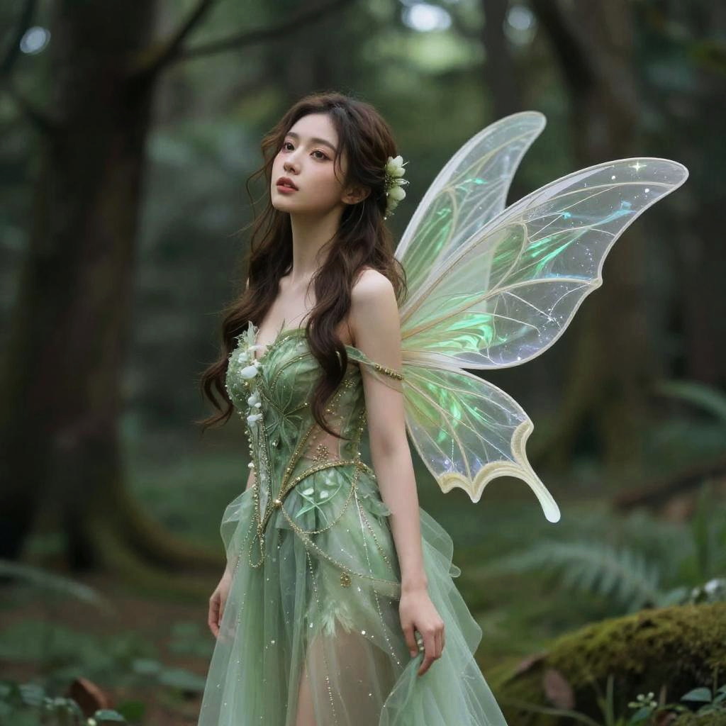 Photograph of an East Asian woman with long, dark brown hair adorned with a small white flower, standing in a lush, forested background. She wears a delicate, green, fairy-like dress with intricate beadwork and a sheer, translucent skirt. Her large, iridescent wings are semi-transparent with a shimmering, greenish-blue glow. She gazes upward with a dreamy expression. The forest background is dark and blurred, with tall trees and patches of moss. Her ethereal appearance contrasts with the natural, earthy surroundings. The lighting highlights her face and wings, creating a magical, otherworldly atmosphere.