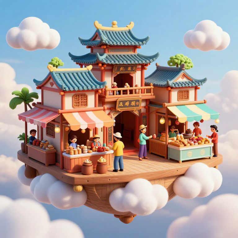 A vibrant 3D-rendered scene depicts a bustling floating marketplace with traditional Asian architecture, where merchants under colorful awnings sell goods alongside silken clouds, while buyers engage in lively bartering, blending dreams, memories, and laughter beneath a serene sky.