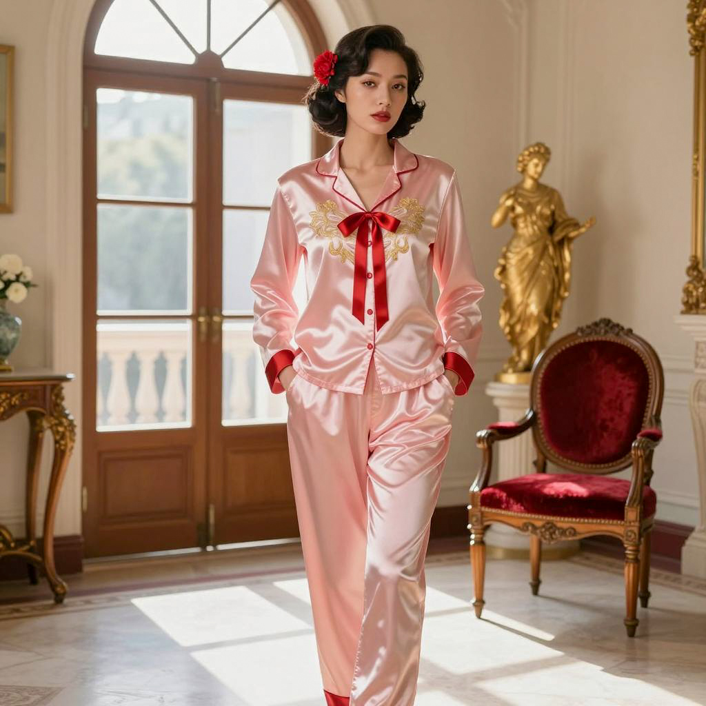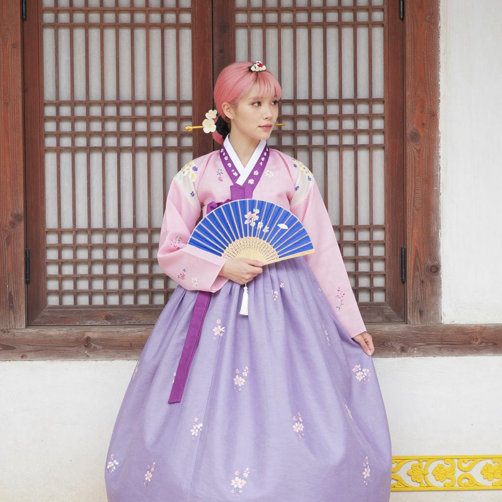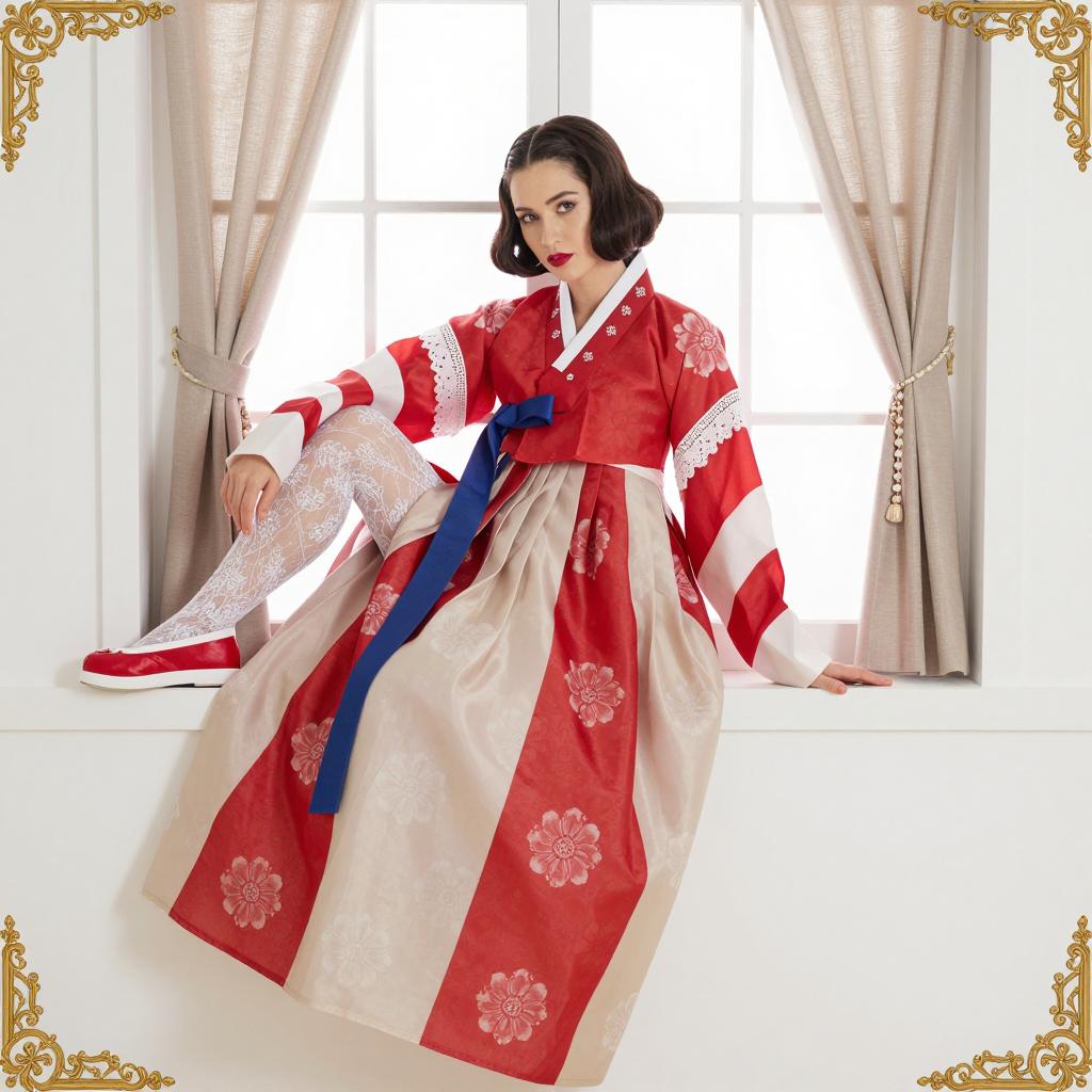 Female model in traditional Korean hanbok, red and beige, floral patterns, wide sleeves, white lace trim, blue ribbon belt. Dark short bob haircut, red lipstick, sitting on white ledge, right leg crossed, left arm resting. Red shoes with white stripes, white lace stockings. Background: white window, beige curtains. Gold decorative frames on corners. Intense, defined expression. Full-body view.