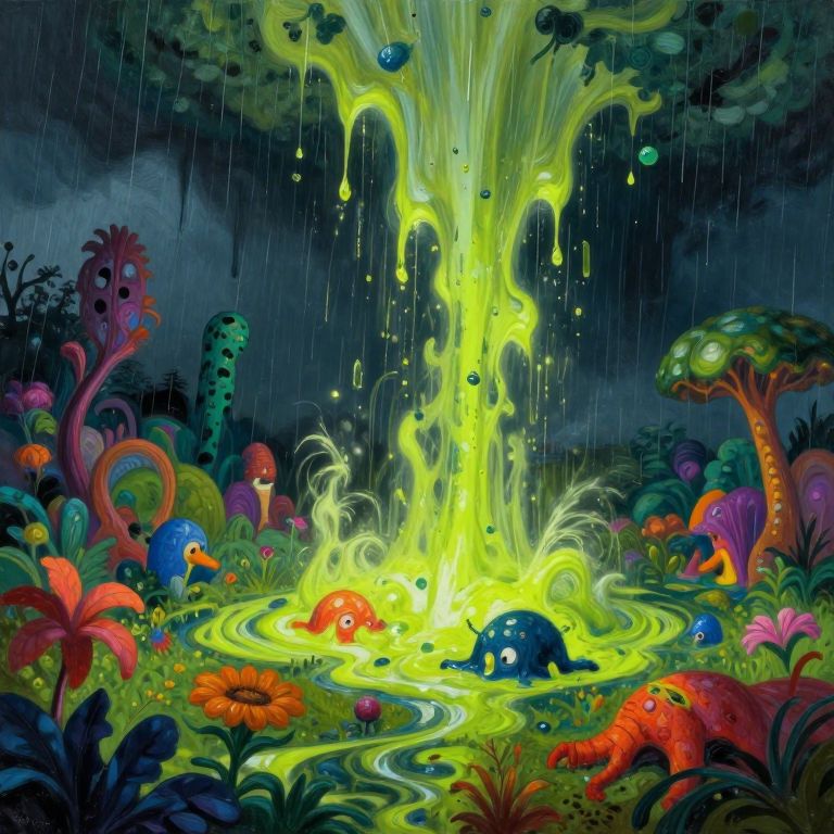 Caustic bright acid rain falling on a surreal landscape, melting flora and fauna, vibrant colors clashing with a dark sky, fantastical and eerie mood, painterly style, imaginative environment design