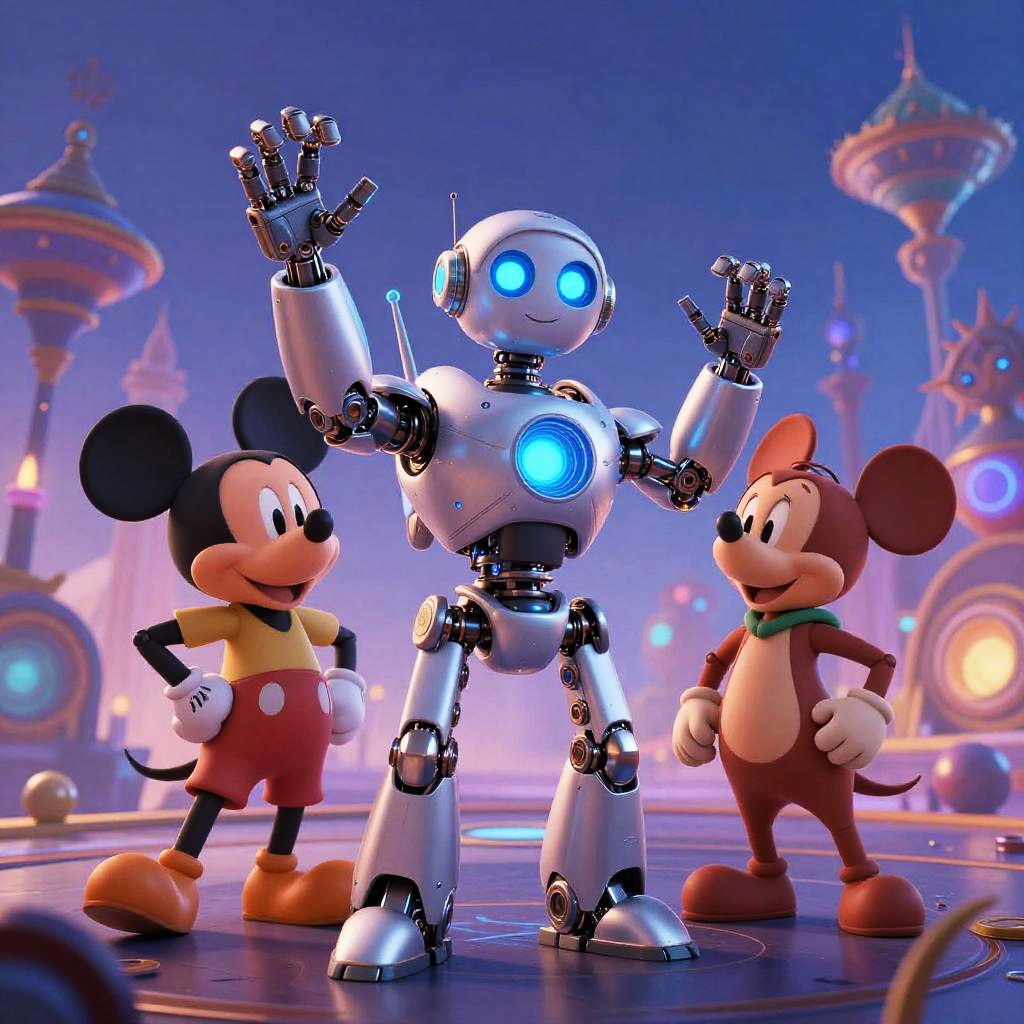 AI Disney generator, futuristic digital art style, blending classic Disney animation with sleek AI and robotics, vibrant colors, whimsical characters interacting with advanced technology, magical yet tech-inspired background, high detail and enchanting atmosphere