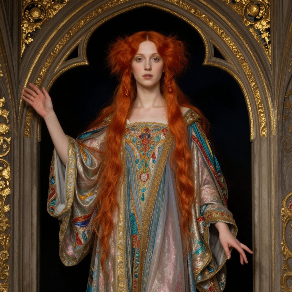 A digital artwork reminiscent of Pre-Raphaelite style, featuring a woman with vibrant red hair and ethereal features, dressed in a flowing, ornate gown with intricate embroidery, set against a richly detailed, gothic-inspired archway with golden embellishments and dramatic lighting.