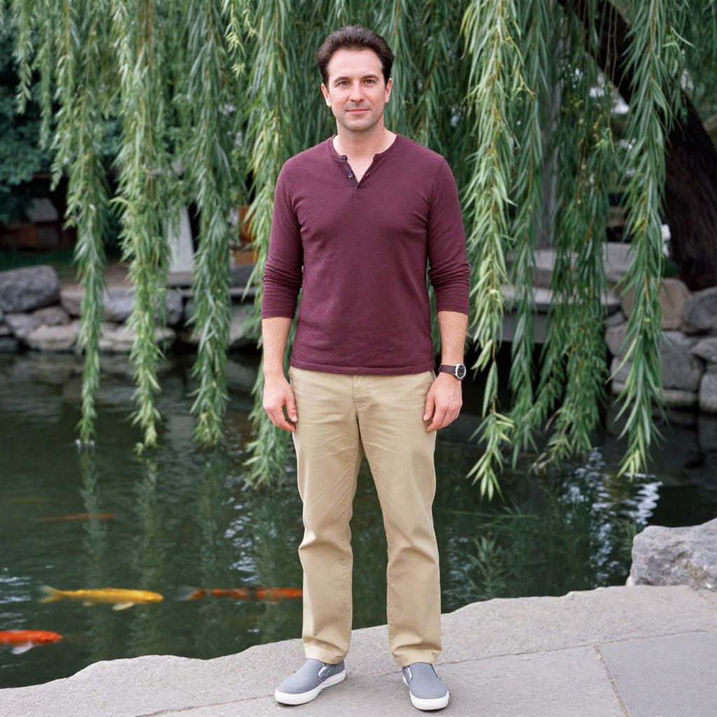 A man, burgundy henley shirt, light tan chinos, grey slip-on skate shoes, standing by a serene koi pond, willow trees draping, eastman film stock, relaxed expression, soft smile. Man has masculine face and piercing eyes