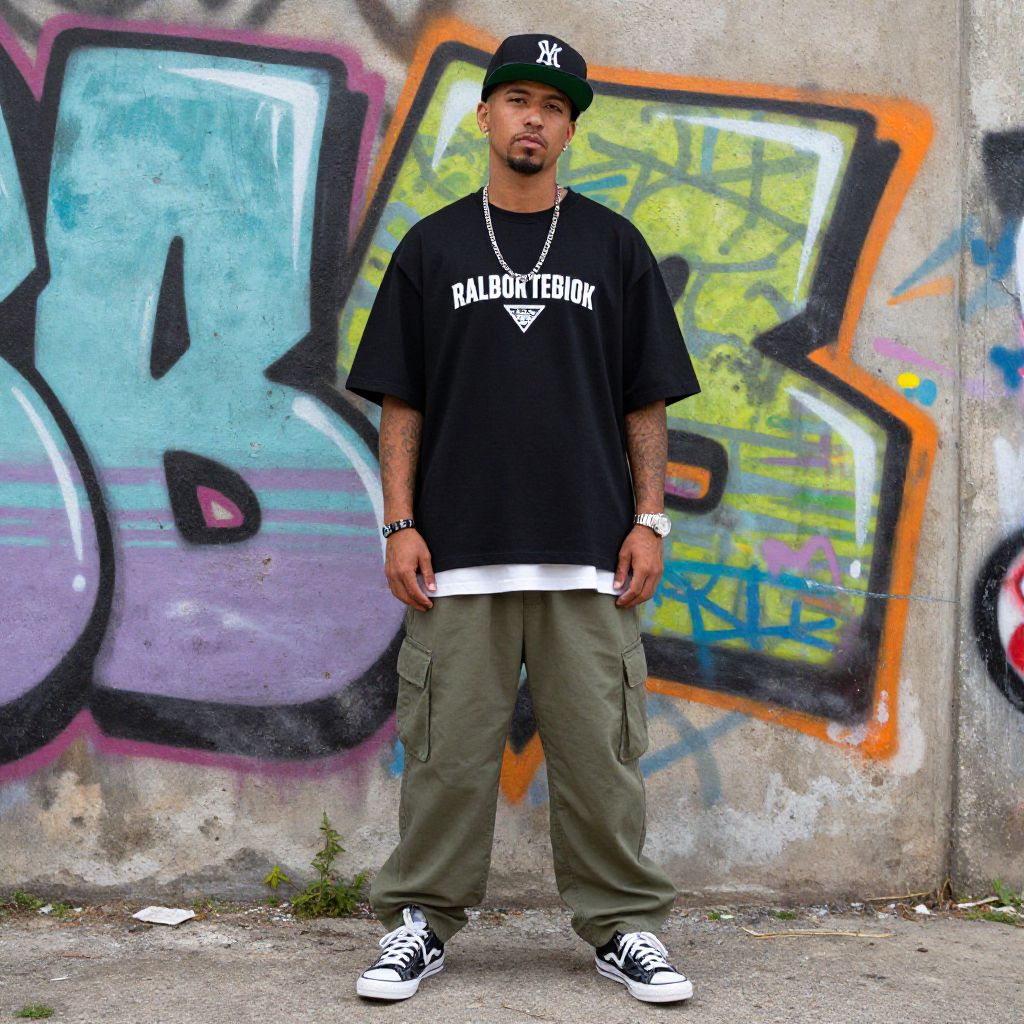 A stylish man stands confidently in front of a vibrant graffiti wall, embodying hip-hop culture with his streetwear fashion and bold attitude.