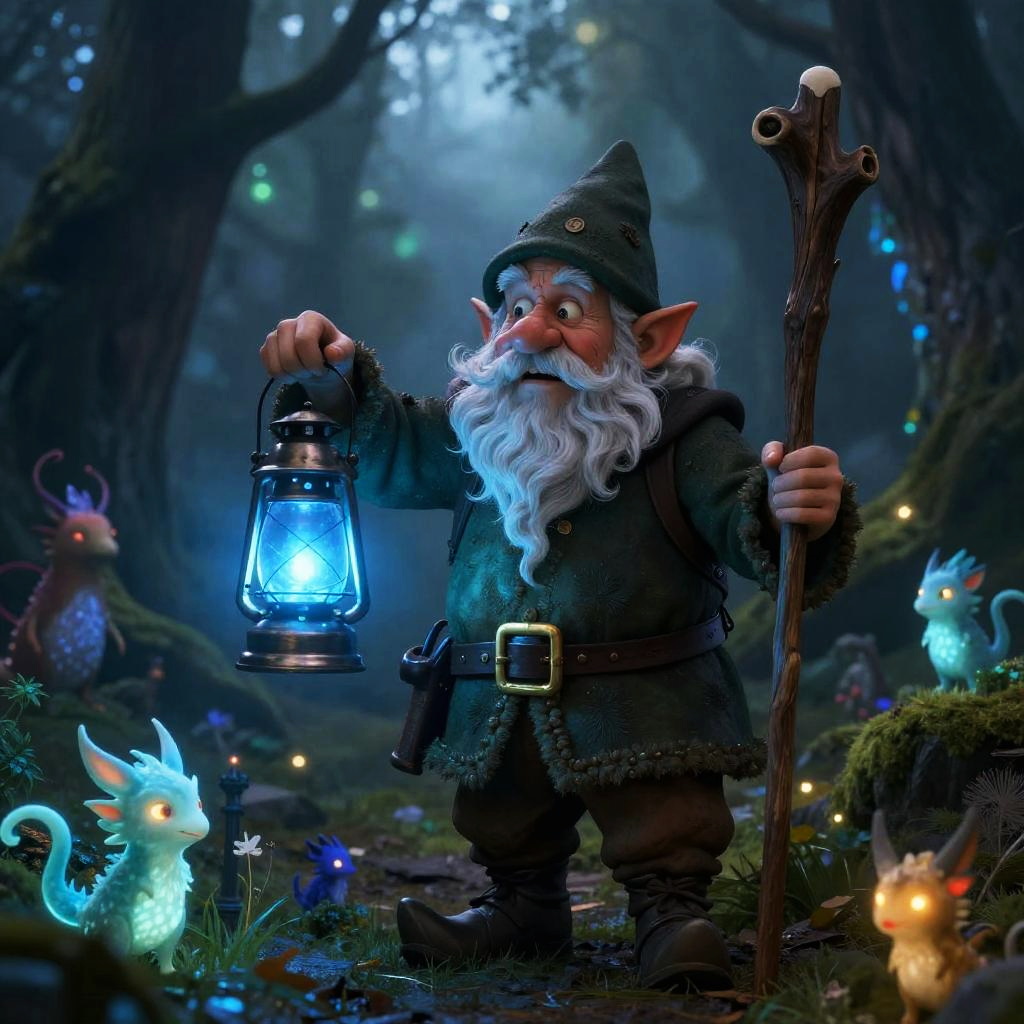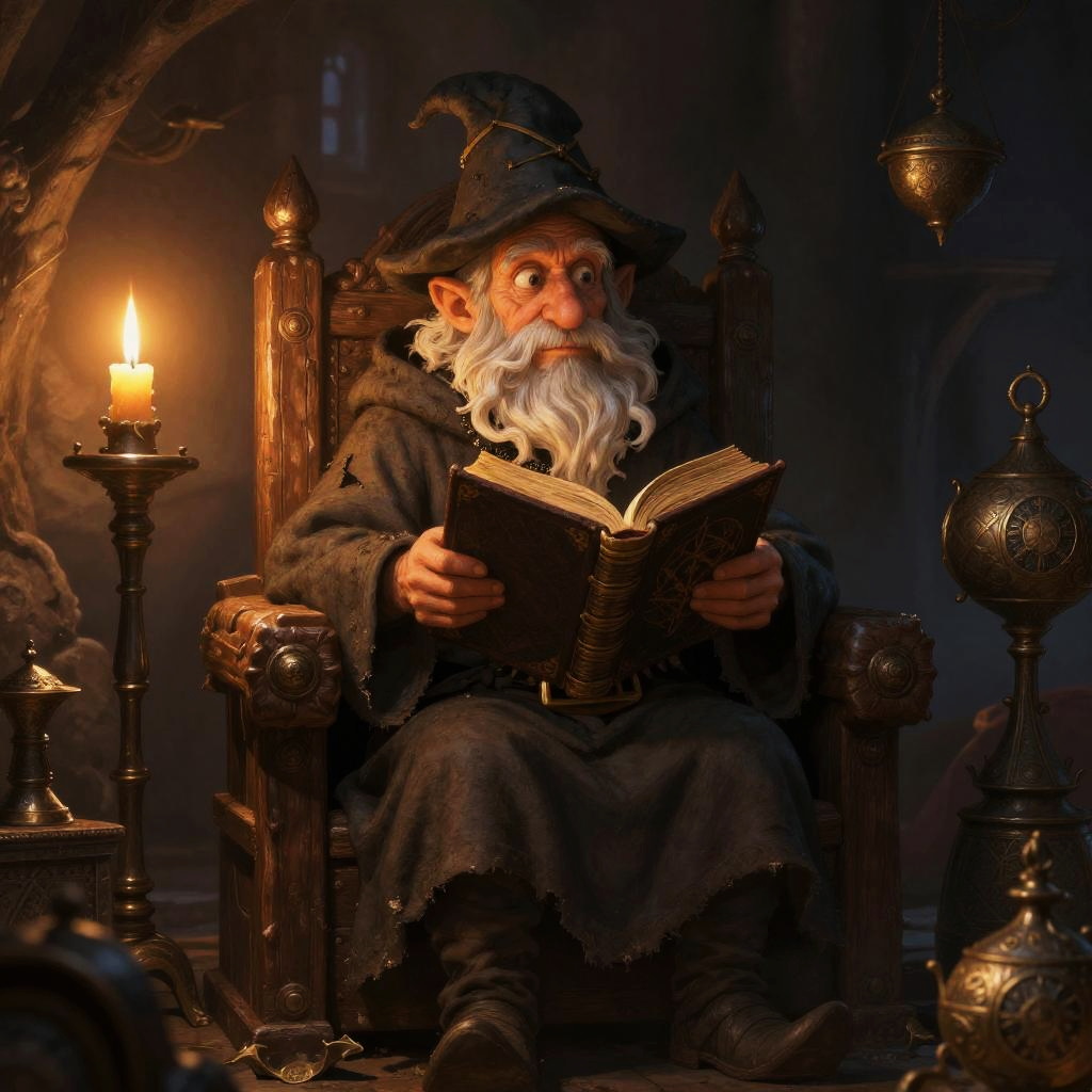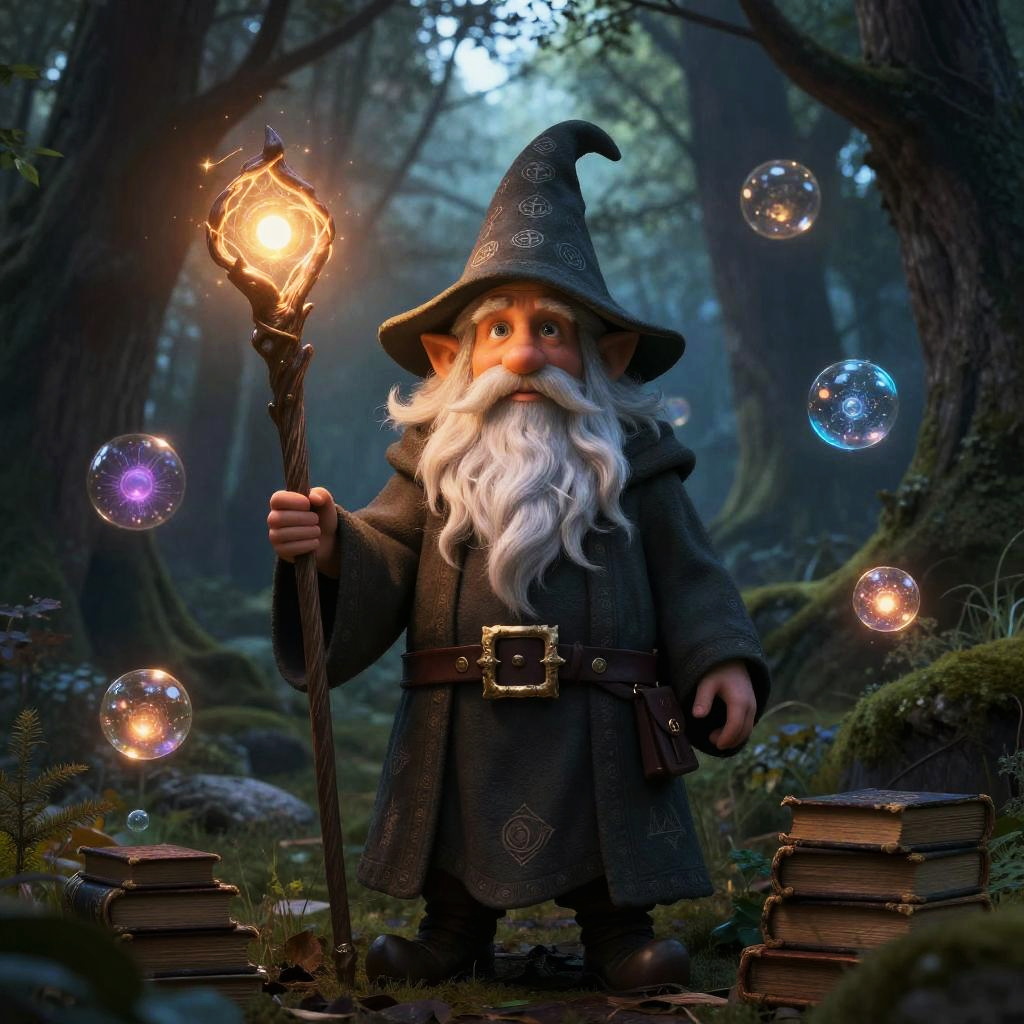 Old gnome wizard standing in an ancient forest, holding a glowing staff, long white beard and a pointed hat covered in mystical runes, surrounded by floating magical orbs and ancient books, soft twilight lighting, fantasy art style.