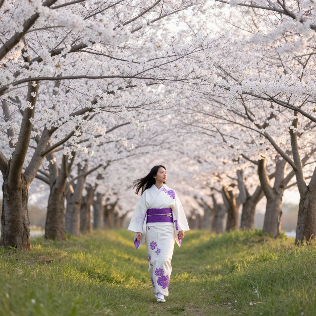 Photograph of an Asian woman walking down a grassy path lined with cherry blossom trees in full bloom. She has long black hair and wears a white kimono adorned with purple floral patterns, accented with a purple obi belt. The cherry blossoms create a pink, white canopy overhead, with sunlight filtering through. The background shows a blurred, green landscape. The woman is centered, looking forward with a serene expression, her kimono flowing slightly in the breeze. The image exudes a sense of tranquility and beauty.