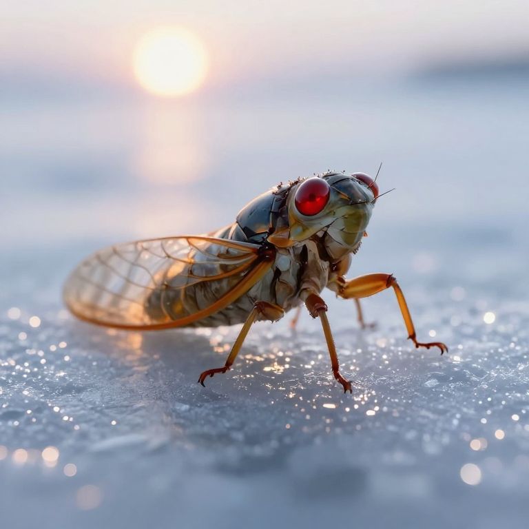 A surreal cicada with translucent, amber-hued wings stands poised on a shimmering, icy surface, its vivid red eyes reflecting the ethereal light of a distant sun, creating a dreamlike scene where nature and fantasy converge.