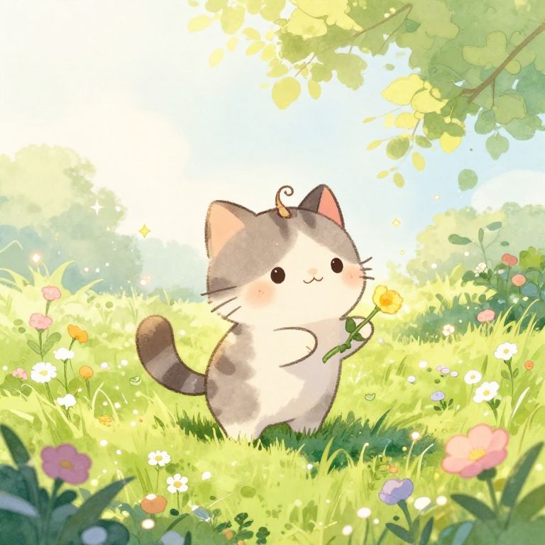 A digital drawing in a cute, chibi style depicts a chubby, gray and white cat with a curly tail holding a yellow flower in its paws. The cat stands in a sunlit meadow filled with colorful flowers and tall green grass. Sunlight filters through the leaves of a tree in the upper right corner, casting a warm, golden glow over the scene. The background is a soft, blurred mix of blues and greens, suggesting a bright, clear day. The cat's expression is content and joyful, with a small, smiling mouth and round, black eyes.