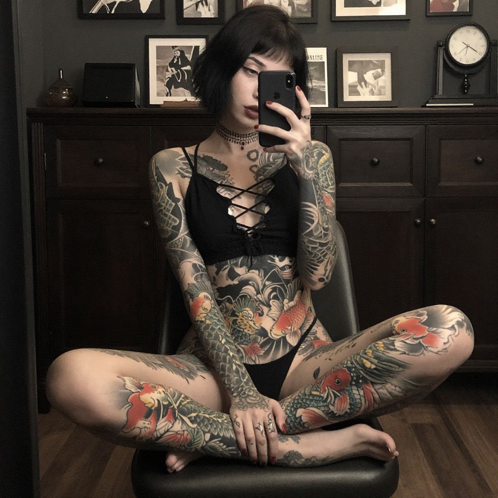 Photograph of tattooed legs in a bubble-filled white bathtub, featuring a large red rose, black skull, and intricate black designs on light skin,