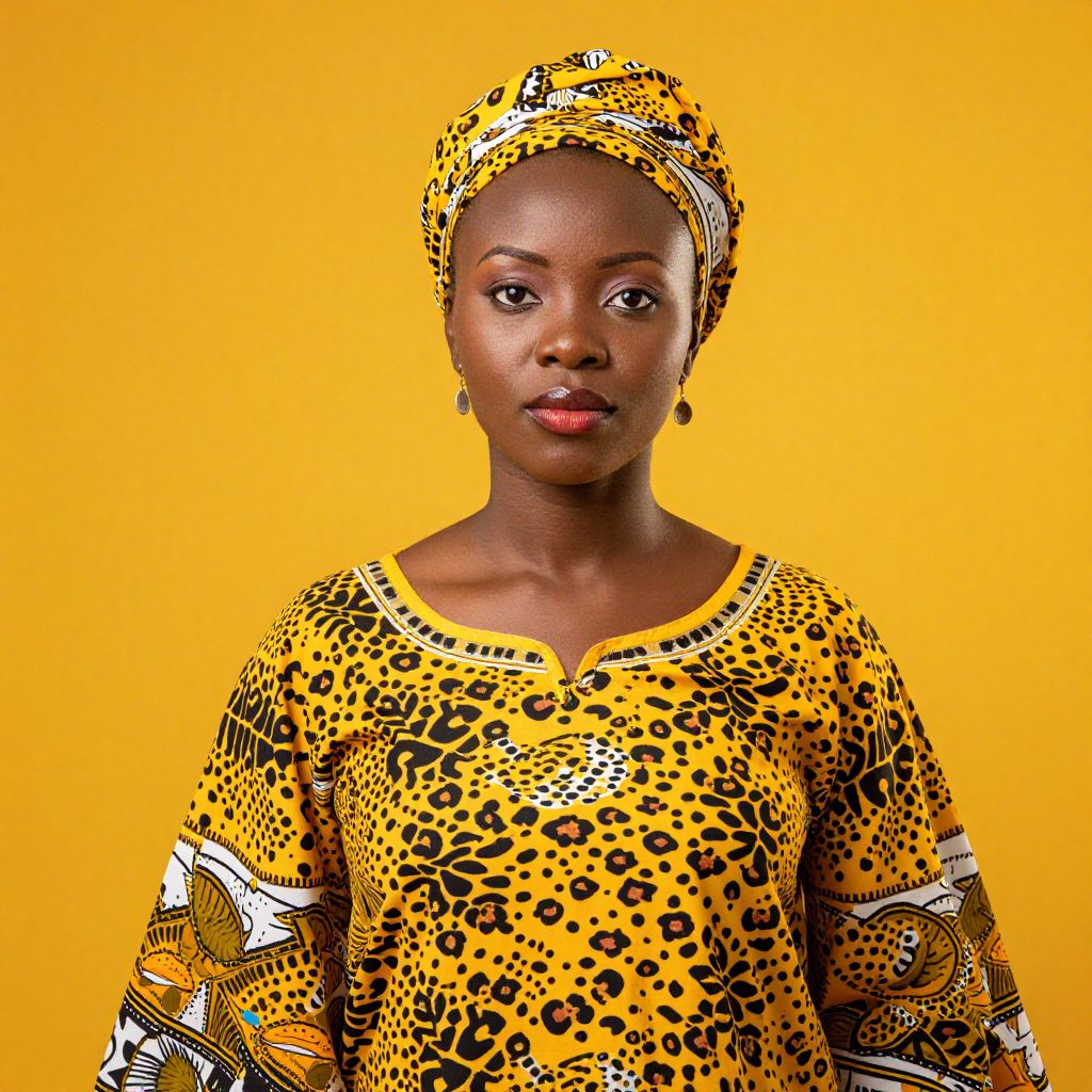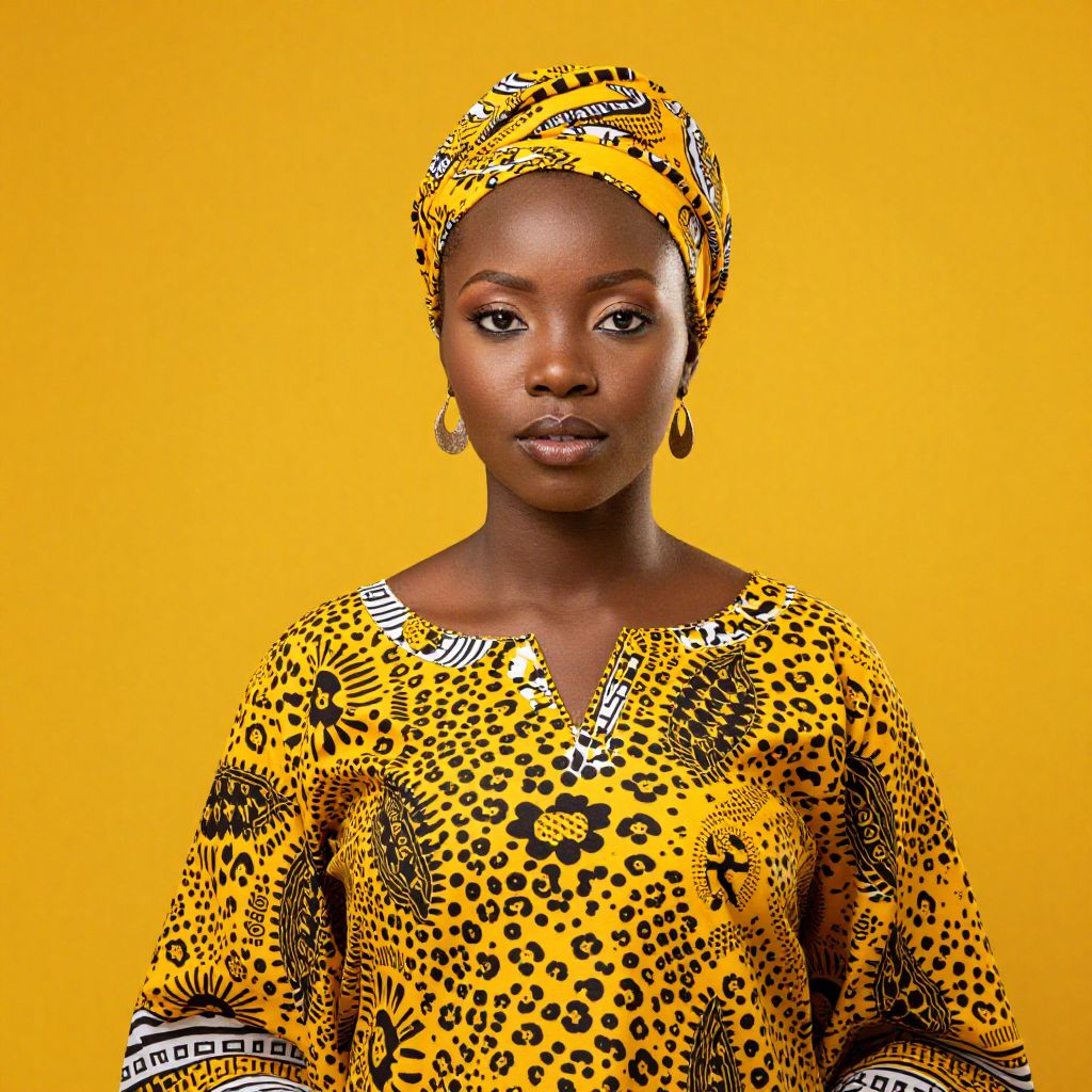 Photograph of a dark-skinned woman with a bright yellow background, wearing a yellow leopard-print dress and matching headwrap, with gold earrings, looking