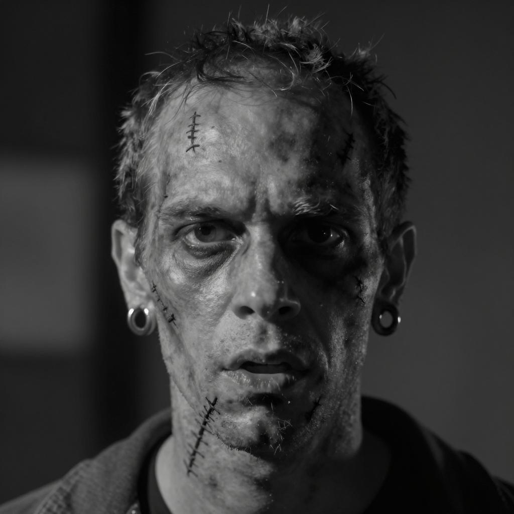 Black and white photograph of a close-up male zombie with short, patchy hair, exposed skin with visible stitches on the forehead and neck, and large ear piercings. Background is dark and blurred. Zombie's expression is neutral with slightly open mouth. Lighting casts shadows on the face, emphasizing stitches and ear piercings.