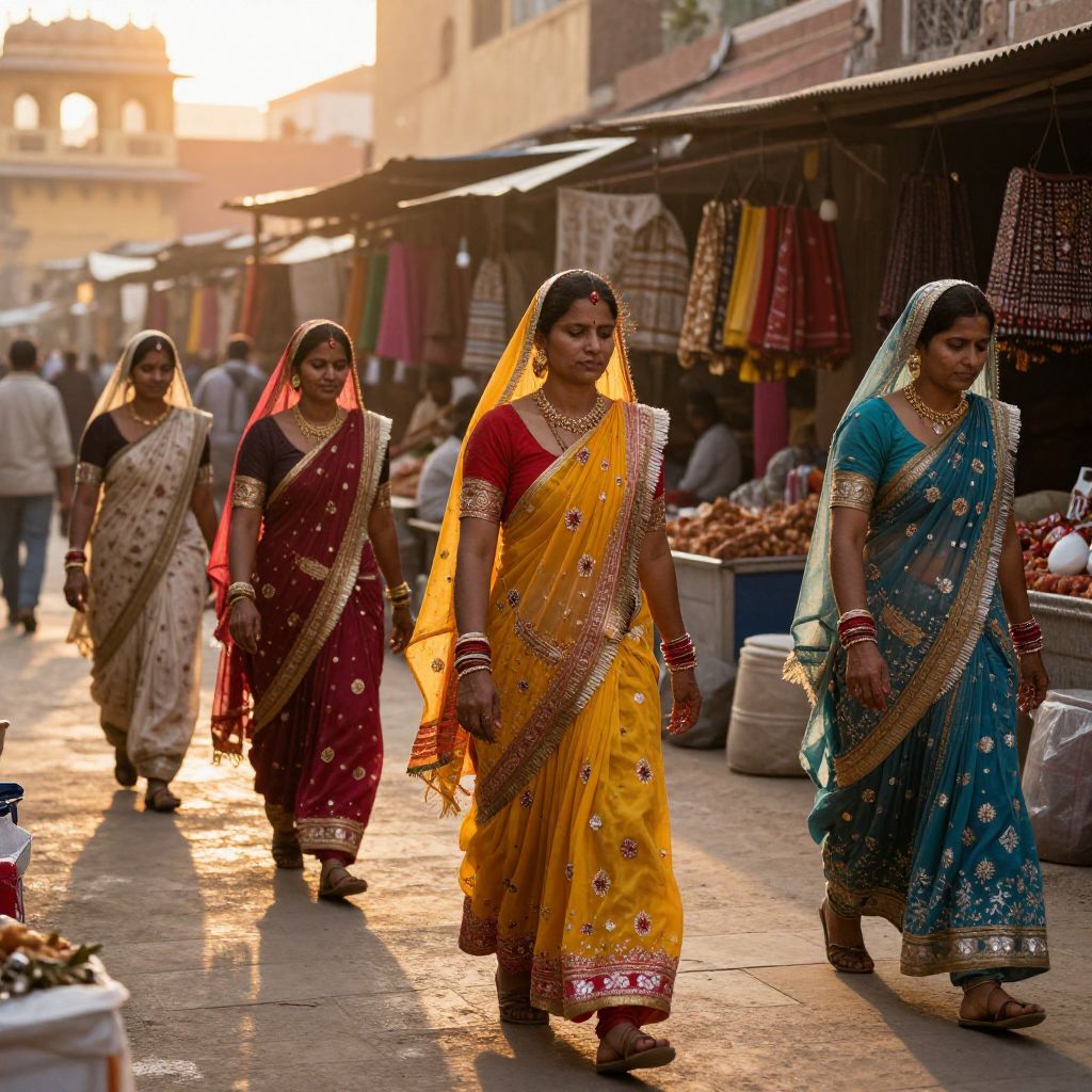 Indian women in traditional sarees walking through a vibrant market in Jaipur, golden sunlight filtering through havelis, rich colors and cultural details, photorealistic, detailed, high resolution, cinematic lighting, Indian lifestyle