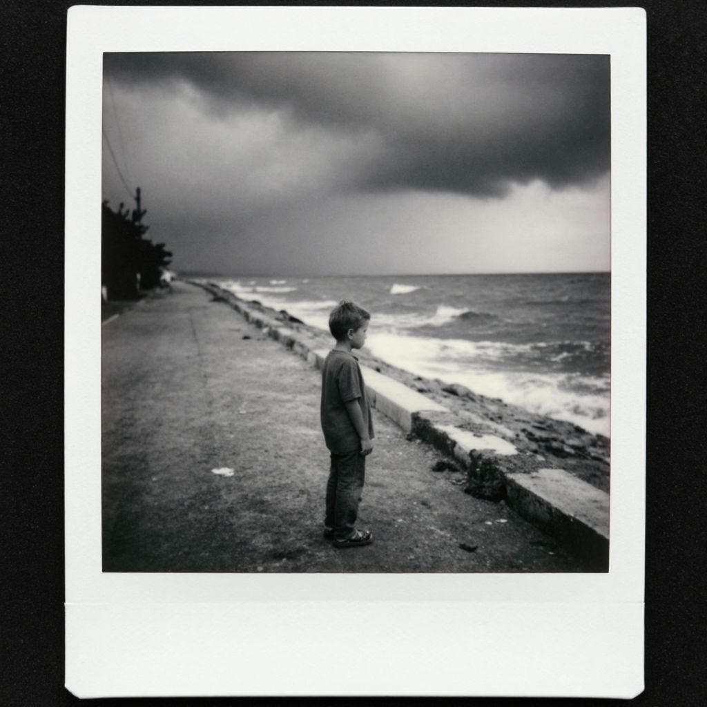 Photo polaroid of sad and lonely child in the middle of the street, looks towards the stormy sea, loneliness, war, black and white ,photorealistic, 35mm film,