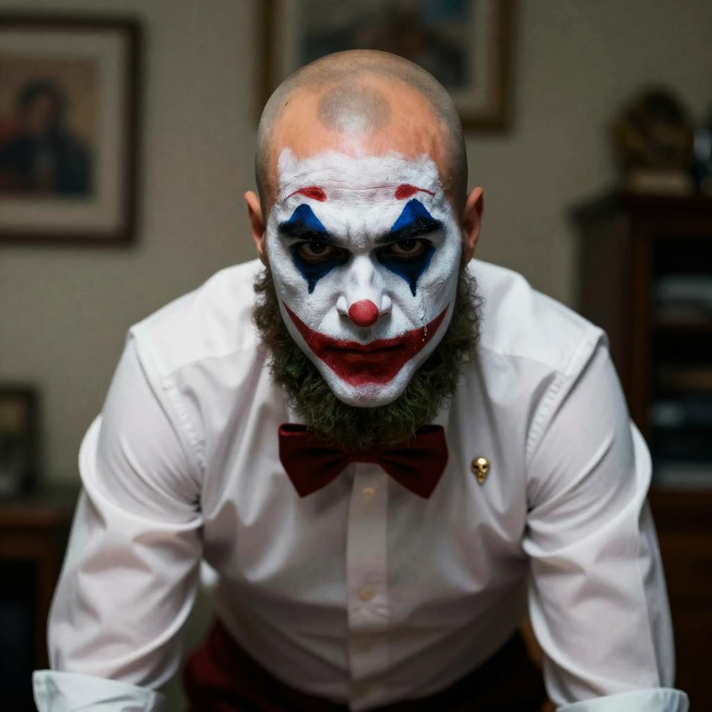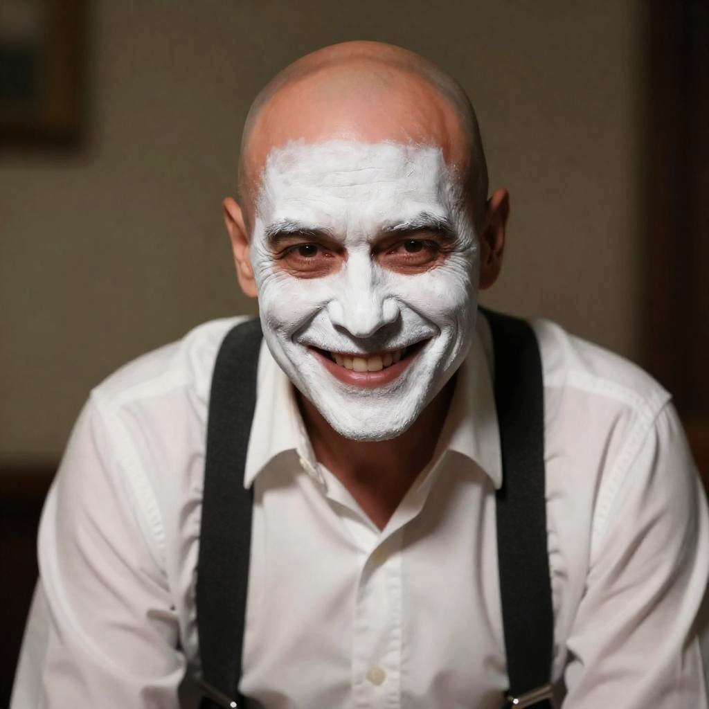 Middle-aged bald man with smeared white face paint, grinning intensely, wearing a white shirt with black suspenders, leaning forward. Warm, dimly lit background with shadows. Photorealistic, cinematic style.