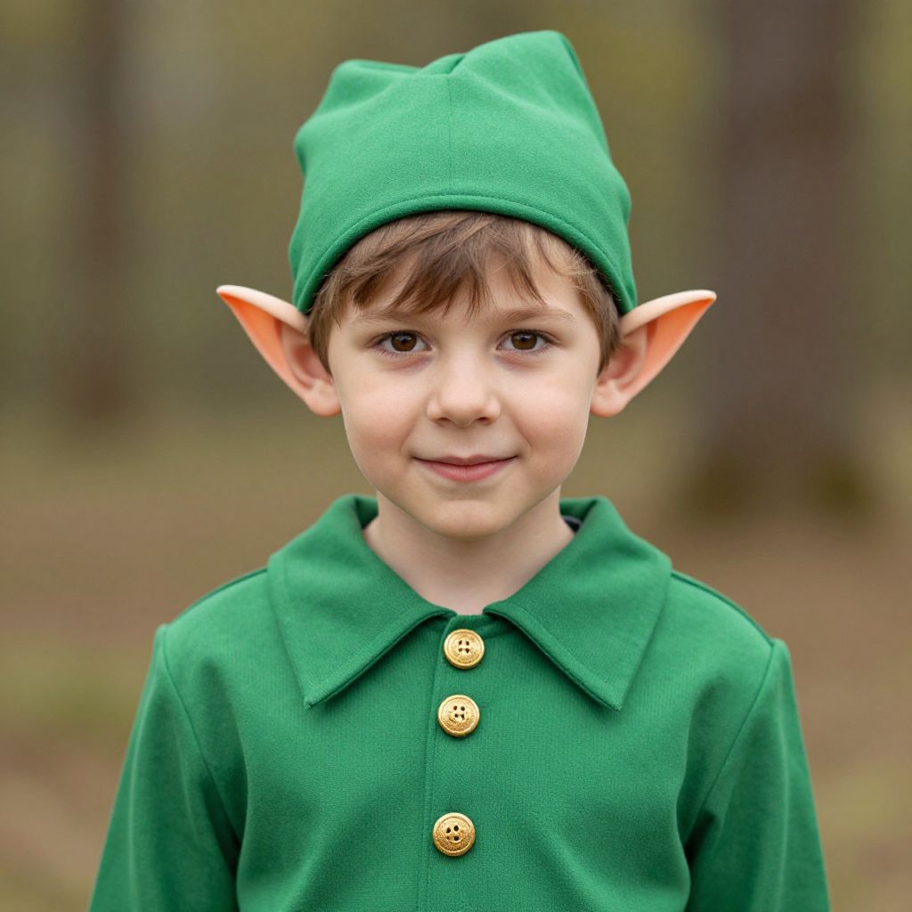 Photograph of a young boy with fair skin, brown eyes, and brown hair, wearing a green elf costume with pointed ears and gold buttons, smiling