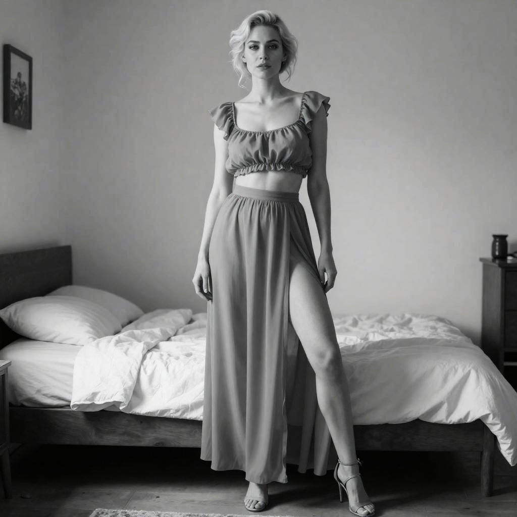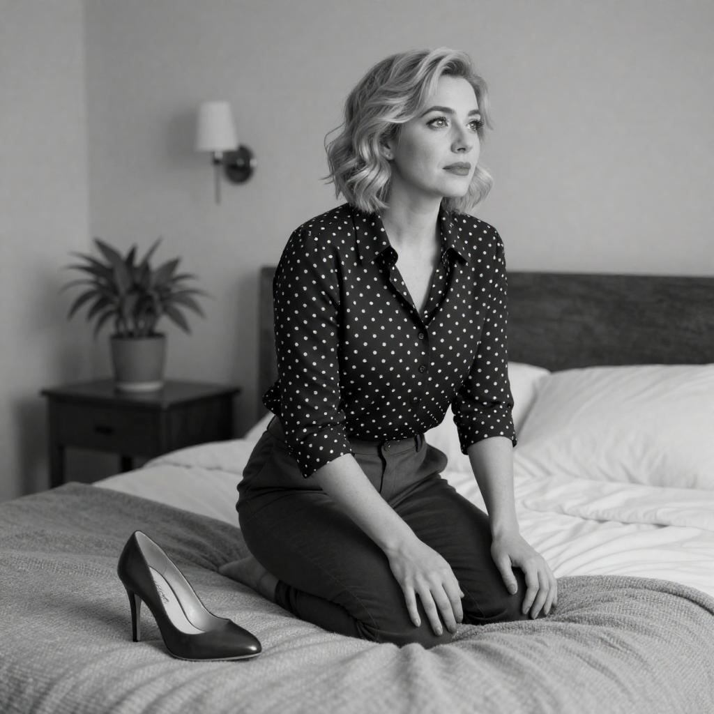 Black and white photograph of a woman with short, wavy blonde hair, wearing a polka dot blouse, kneeling on a bed with a ured blanket. She looks to the right with a calm expression. A high-heeled shoe and a dark shoe lie on the bed in the foreground. A table with a plant and a wall lamp are in the background.