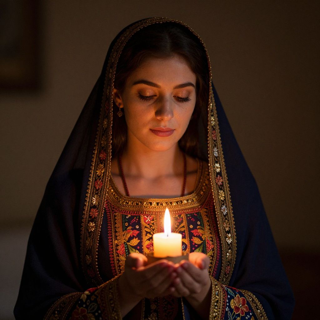 In the hushed glow of candlelight, a woman adorned in vibrant tradition cradles the flame, her expression a tender blend of devotion and serenity, symbolizing the timeless bond between love and faith.