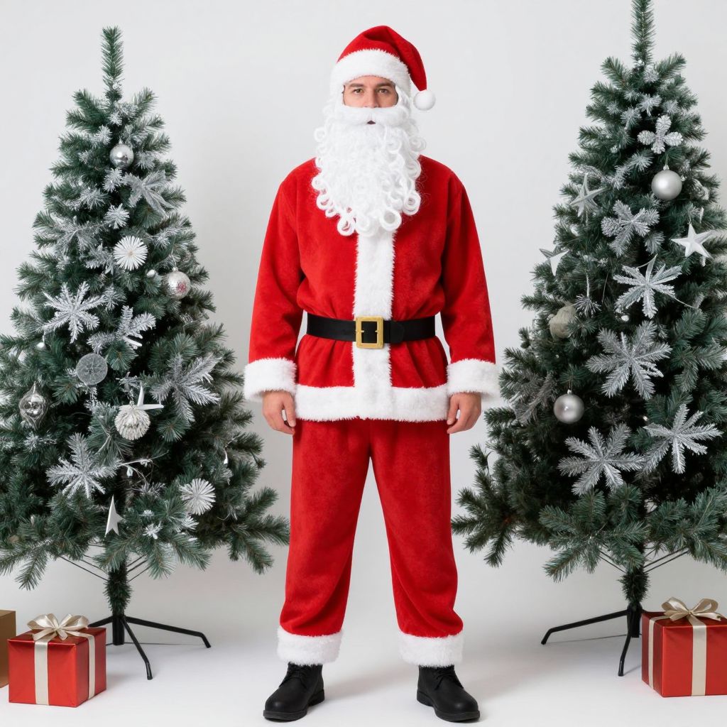 Modern Christmas Outfit Costume, man in santa suit standing in front of a christmas tree