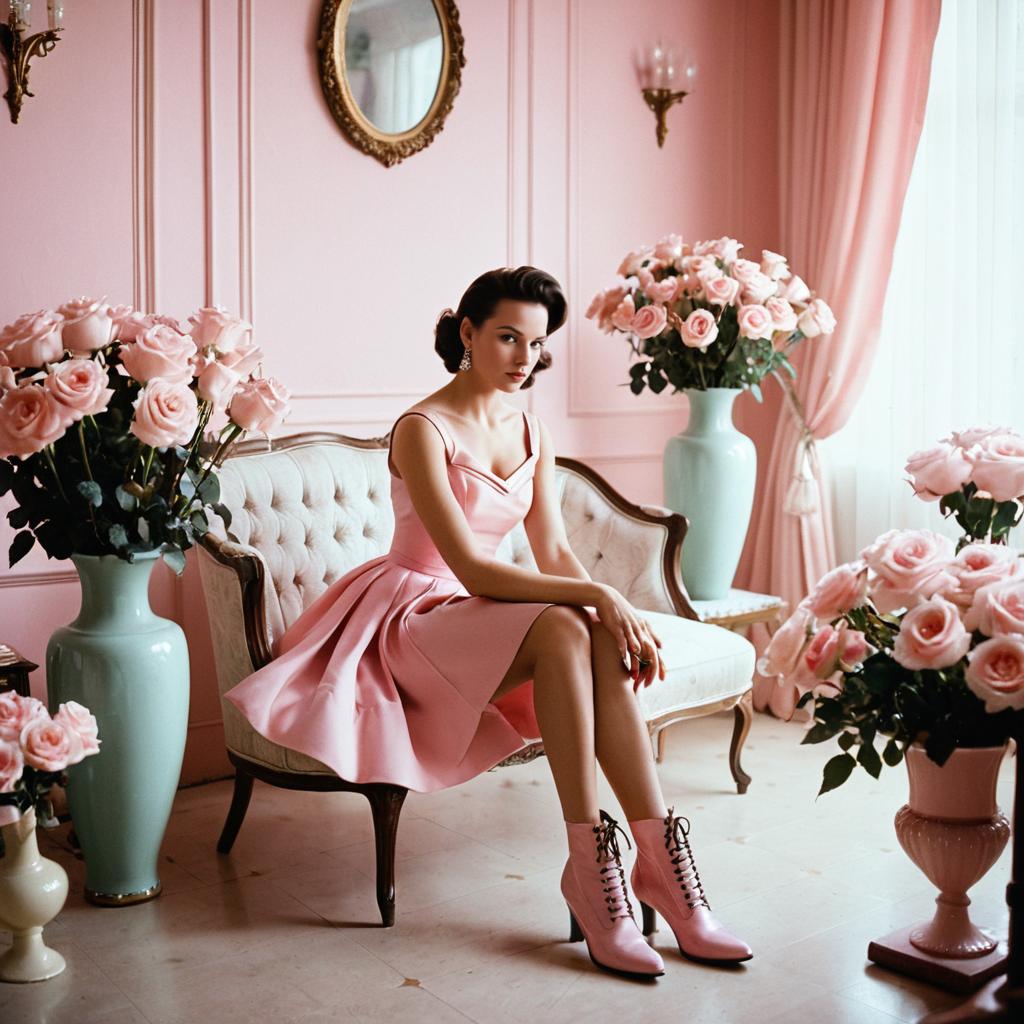 A glamorous woman in a vintage 1950s pink dress and boots sitting elegantly surrounded by pastel pink roses and decorative vases, soft focus lighting, romantic and delicate atmosphere, retro style interior with floral arrangements