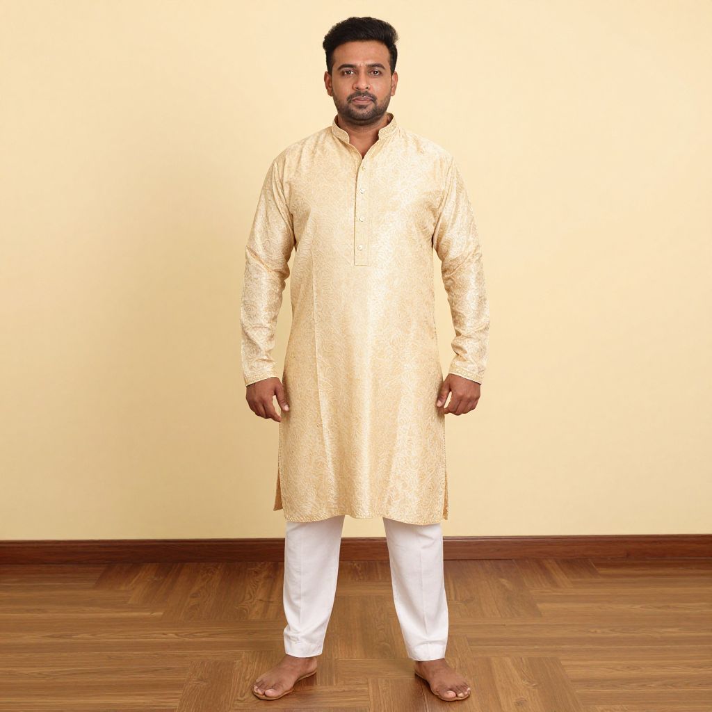 Photograph of a South Asian man standing against a plain, light yellow wall with a wooden floor. He has a medium build, short black hair, and a trimmed beard. He wears a cream-colored, long-sleeved, knee-length kurta with subtle embroidery and white pajama pants. His feet are bare, showing brown sandals. The man has a serious expression and is centered in the frame, with his arms relaxed by his sides. The lighting is even, highlighting the textures of his clothing and the wooden floor. The overall style is simple and traditional.