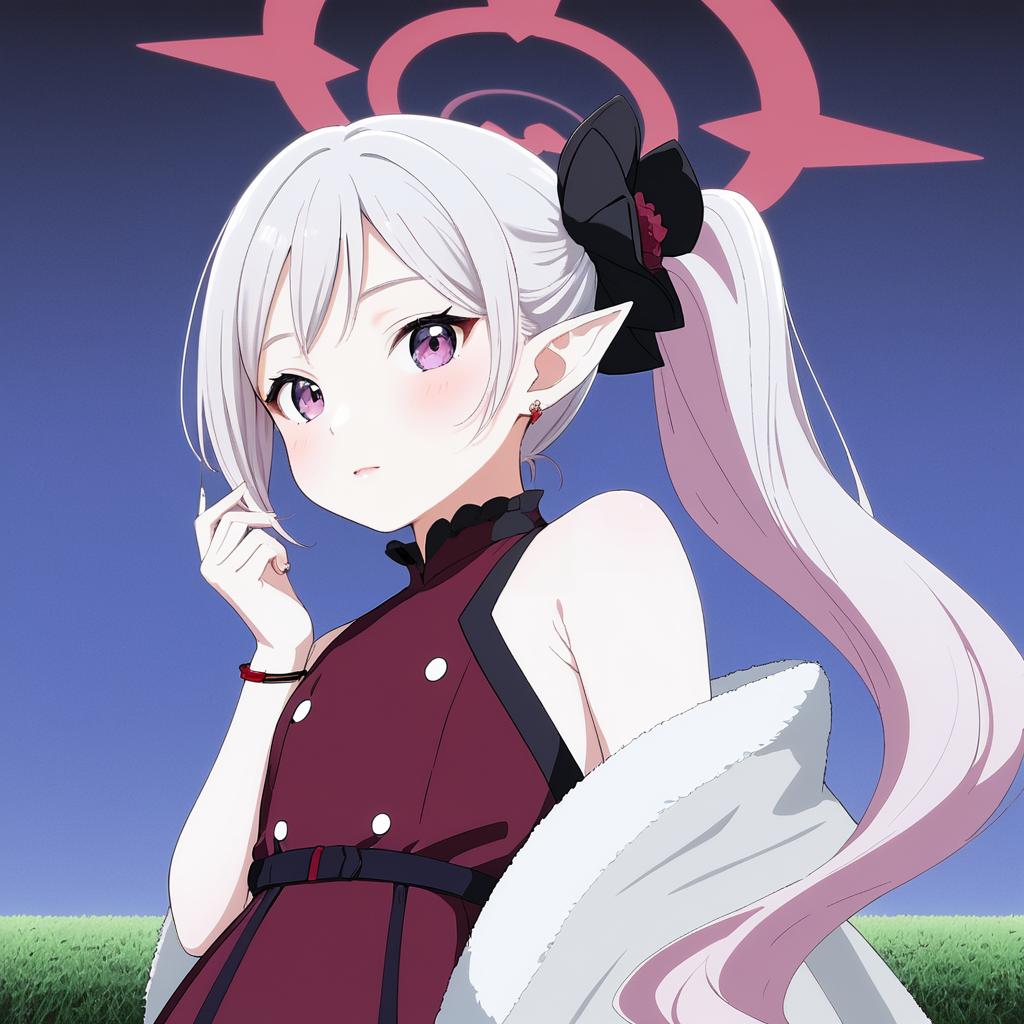 Digital anime-style drawing of a young elf girl with long, white hair tied in a high ponytail with a black bow. She has large, expressive purple eyes and pointed ears. She's wearing a sleeveless, maroon dress with black buttons and a black choker. A white fur-like cloak drapes over her shoulders. She holds her left hand to her chin, with a red bracelet on her wrist. The background features a gradient blue sky and a green grassy field. A pink, glowing halo-like symbol floats above her head. The image is vibrant with clean lines and a soft color palette.