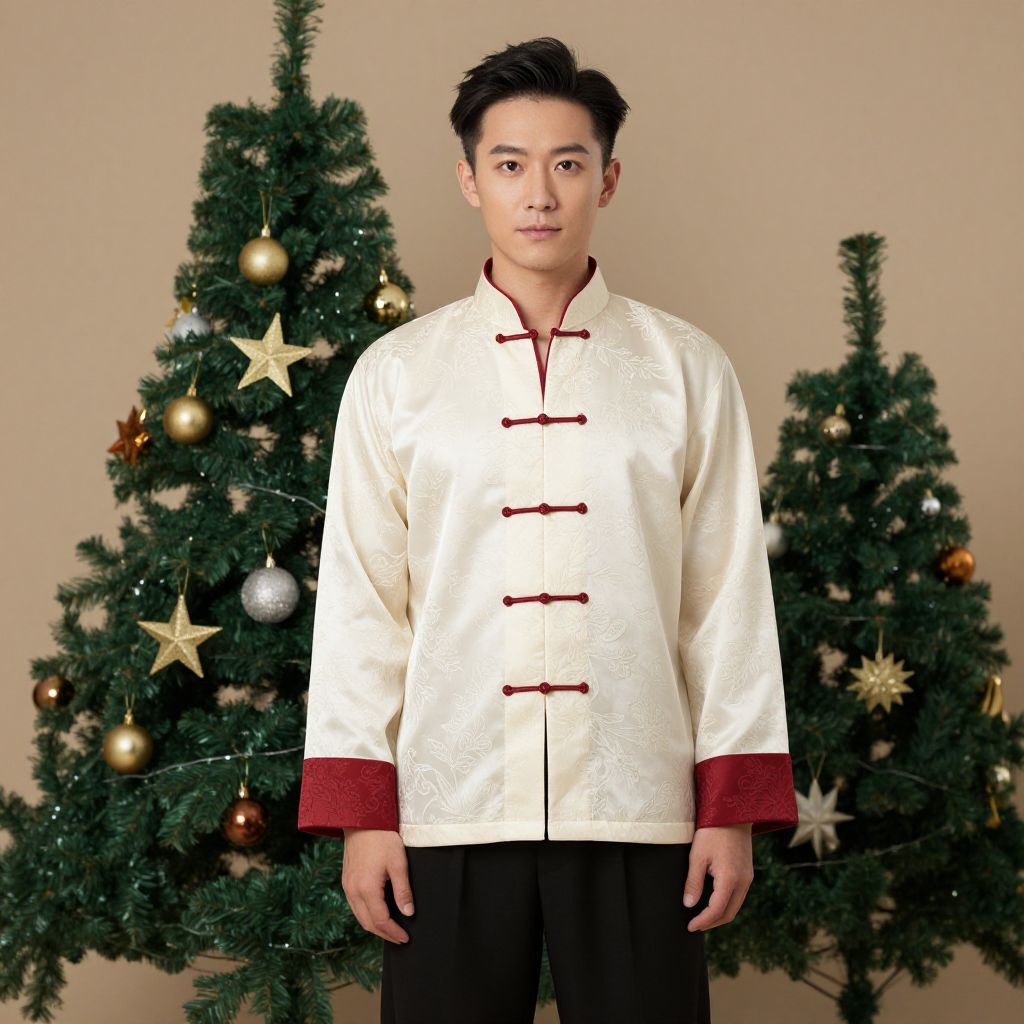 Photograph of an Asian man with short black hair, wearing a white silk Chinese-style tunic with red trim, standing in front of two decorated Christmas