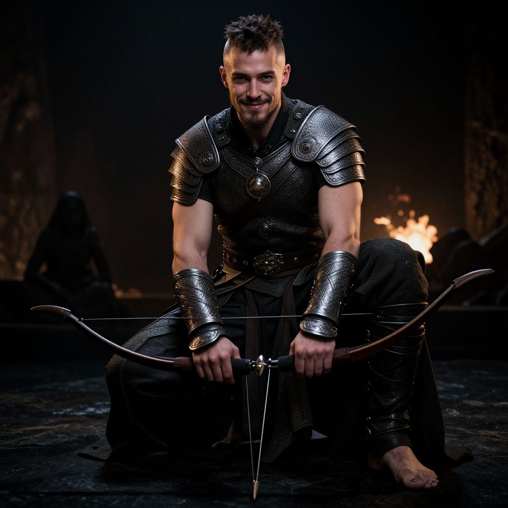 Photograph of a muscular, bearded man in medieval armor, kneeling with a bow and arrow, smiling, dark background with fire.