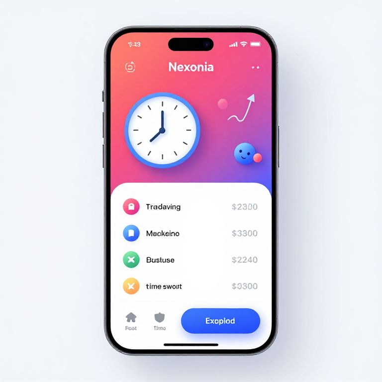 Nexonia mobile app user interface concept in vibrant colors, intuitive design showcasing time tracking and expense management features, smooth transitions, 3D icons, professional yet user-friendly aesthetic, clean typography, futuristic tech style.
